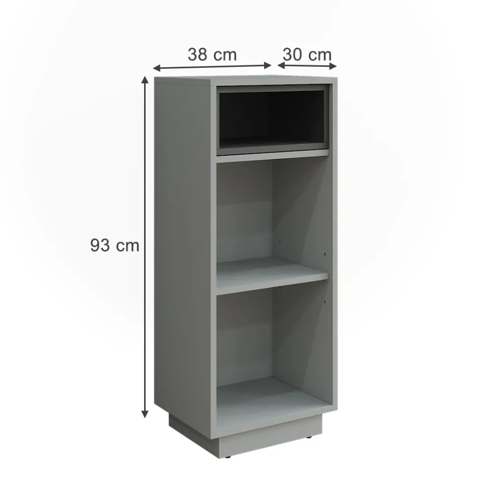 - MAßE: Der Stauraumschrank hat die folgenden Maße: Tiefe: 30 cm, Breite: 38 cm, Höhe: 93 cm. Die detaillierten Größen sind auf den Fotos ersichtlich.