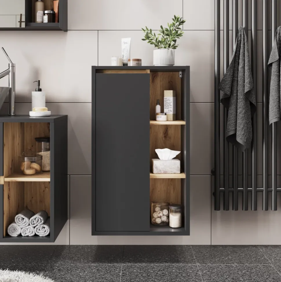 - Moderne Badmöbel mit fünf Fächern bieten viel Stauraum und lassen sich leicht an der Wand montieren.