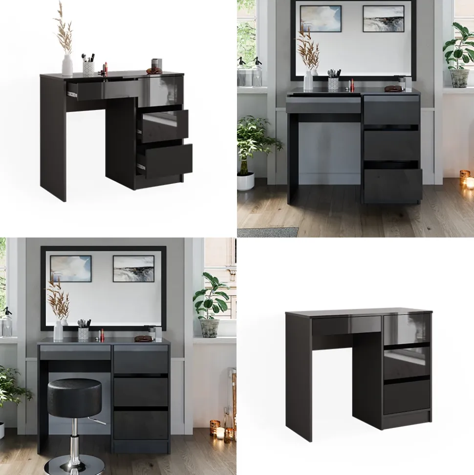 Vier großzügige Schubladen bieten praktische Aufbewahrungslösungen für Ihr Make-Up und Zubehör, um stets gut organisiert zu sein. Das zeitlose Design dieses Schminktisches fügt sich nahtlos in die Ästhetik jedes Schlafzimmers ein, verleiht ihm Eleganz und zeitlose Schönheit. Die einfache Montage ermöglicht eine mühelose Aufstellung, sodass Sie schnell die Vorzüge dieses Möbelstücks genießen können. Die pflegeleichte Oberfläche des Schminktisches erleichtert die Reinigung und trägt dazu bei, dass er lange Zeit in erstklassigem Zustand bleibt.