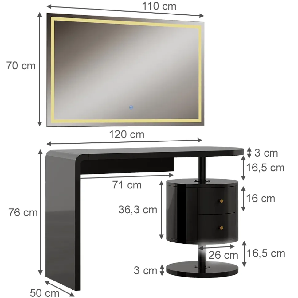 - MAßE: Der Frisiertisch mit LED-Spiegel hat eine Tiefe von 50 cm, eine Breite von 120 cm und eine Höhe von 76 cm. Alle detaillierten Größen sind auf den Fotos angegeben.