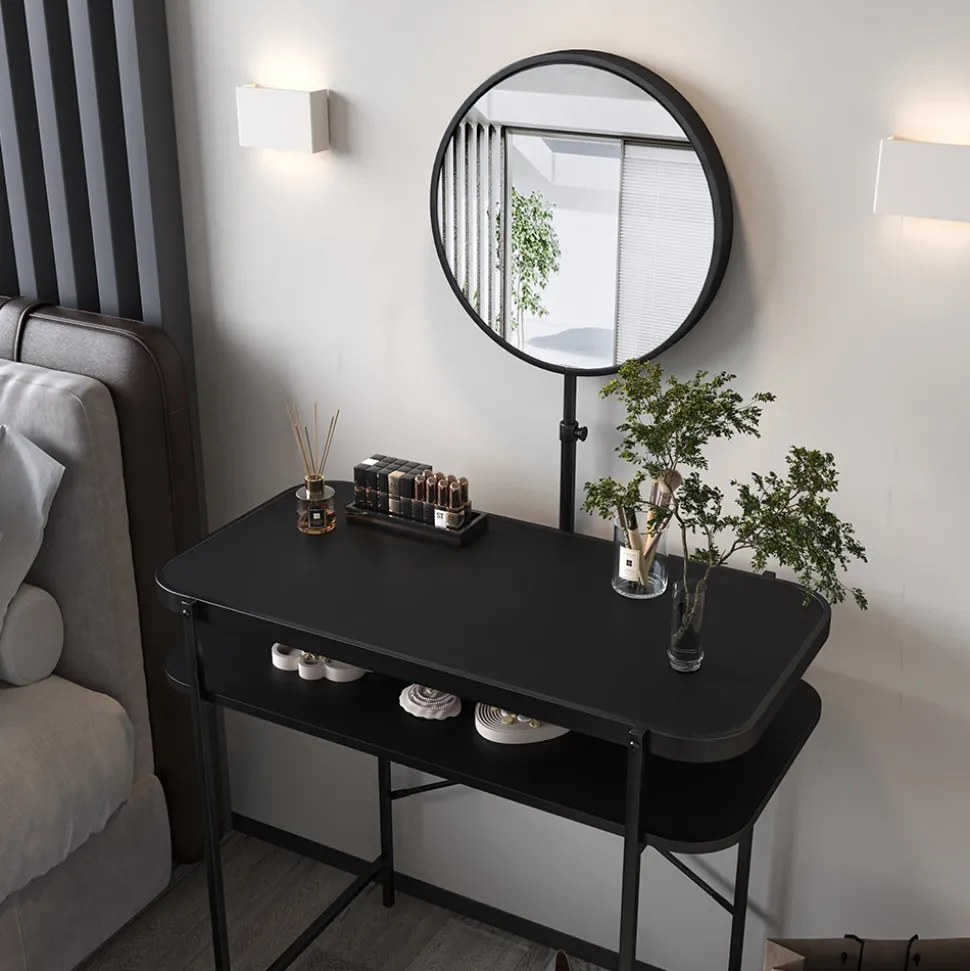 Unser Schminktisch präsentiert sich im zeitlosen Schwarz, was Ihrem Raum eine elegante Note verleiht und ihn zum Blickfang macht. Der Spiegel ist flexibel anpassbar, sodass Sie ihn für verschiedene Anwendungen und Betrachtungswinkel perfekt positionieren können. Die glatten Oberflächen des Schminktisches lassen sich mühelos sauber halten. Ein sanfter Wisch genügt, um seinen makellosen Glanz zu bewahren. Dank der mitgelieferten Montageanleitung gestaltet sich die Installation dieses Schminktisches spielend leicht und stressfrei.