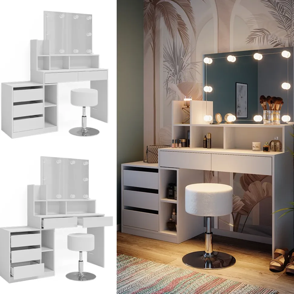 - LIEFERUMFANG: Im Paket enthalten sind der Schminktisch inklusive Montagematerial und -anleitung, 1 LED-Lampe und 1 Hocker, damit Sie sofort mit Ihrer Beauty-Routine beginnen können.