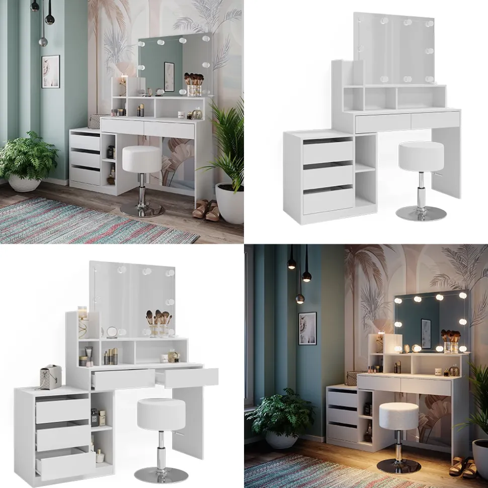 - Entdecken Sie unsere Frisierkommode Anja in strahlendem Weiß mit großem Spiegel. Inklusive LED-Lampe, Hocker und Kosmetiktisch für Ihre perfekte Beauty-Routine.