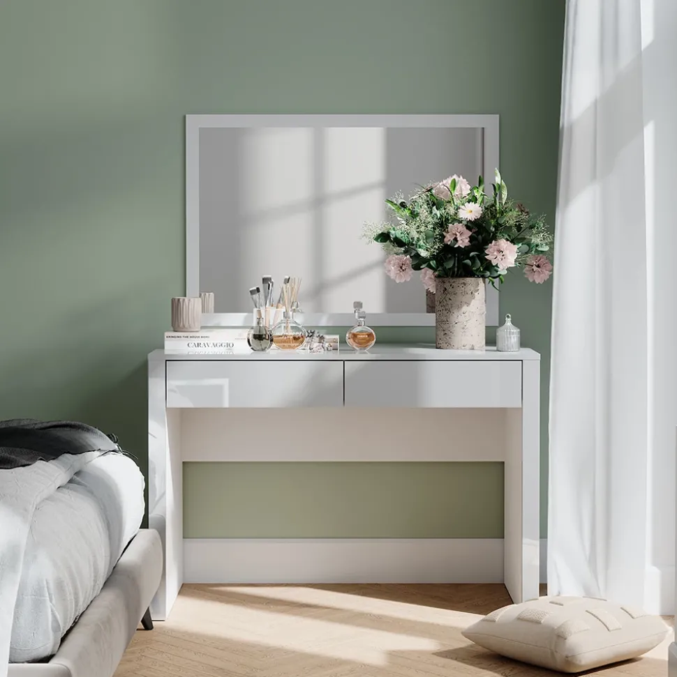 Der Schminktisch Annabelle besticht durch sein elegantes, weißes Design und bietet großzügigen Stauraum für Kosmetikprodukte und Accessoires. Mit seinem modernen Stil und der praktischen Spiegelfunktion ist er eine ideale Ergänzung für jedes Schlafzimmer oder Ankleidezimmer.