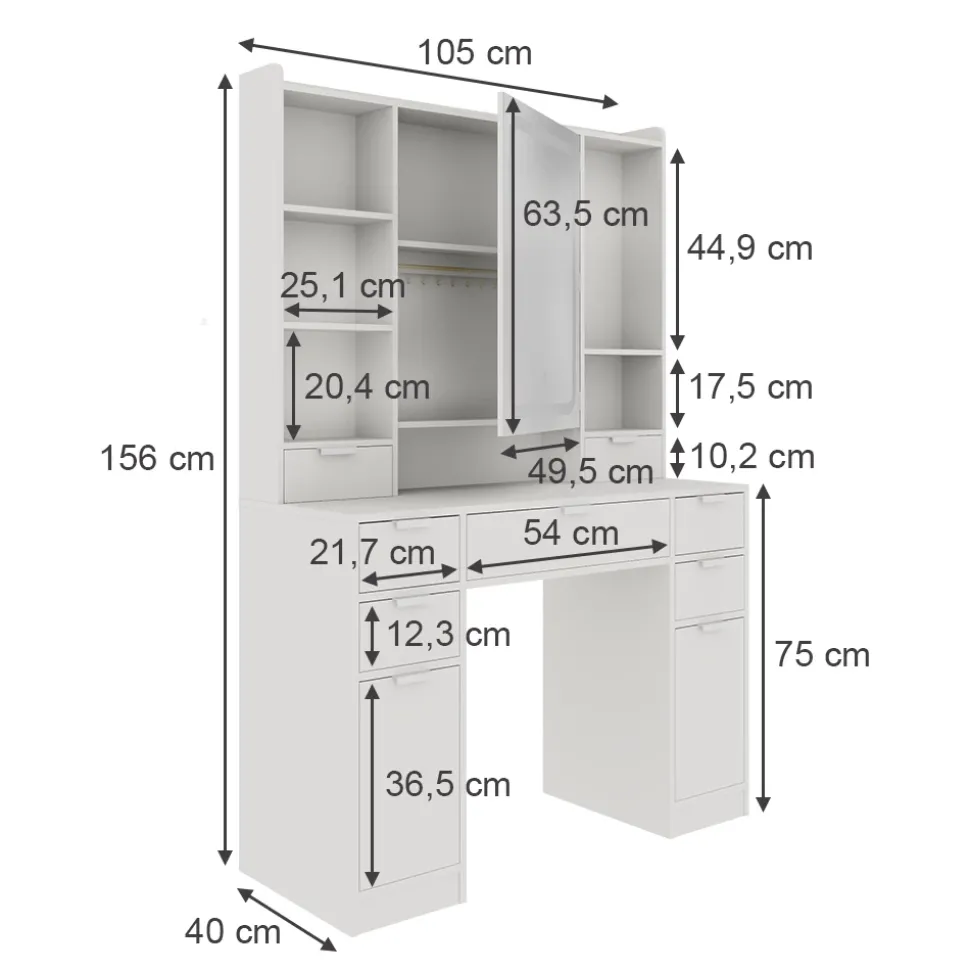 - MAßE: Der Frisiertisch hat eine Tiefe von 40 cm, eine Breite von 105 cm und eine Höhe von 156 cm.