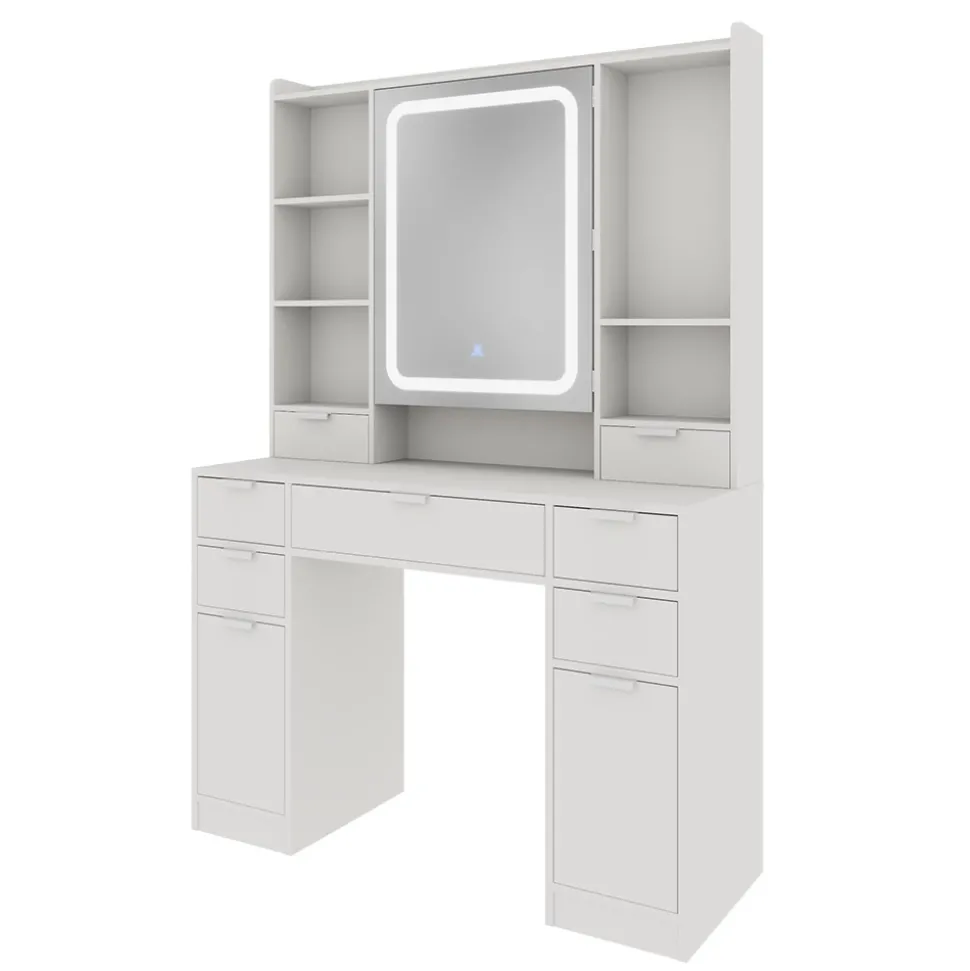 Der Schminktisch Solea mit LED-Spiegel vereint elegantes Design mit praktischer Funktionalität. Der integrierte LED-Spiegel sorgt für eine optimale Beleuchtung, während der Tisch mit ausreichend Stauraum für Kosmetik und Accessoires aufwartet.