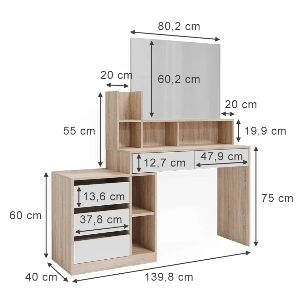 - MAßE: Der Kosmetiktisch hat eine Tiefe von 40 cm, eine Breite von 139,8 cm und eine Höhe von 115 cm. Die detaillierten Größen sind auf den Fotos angegeben.