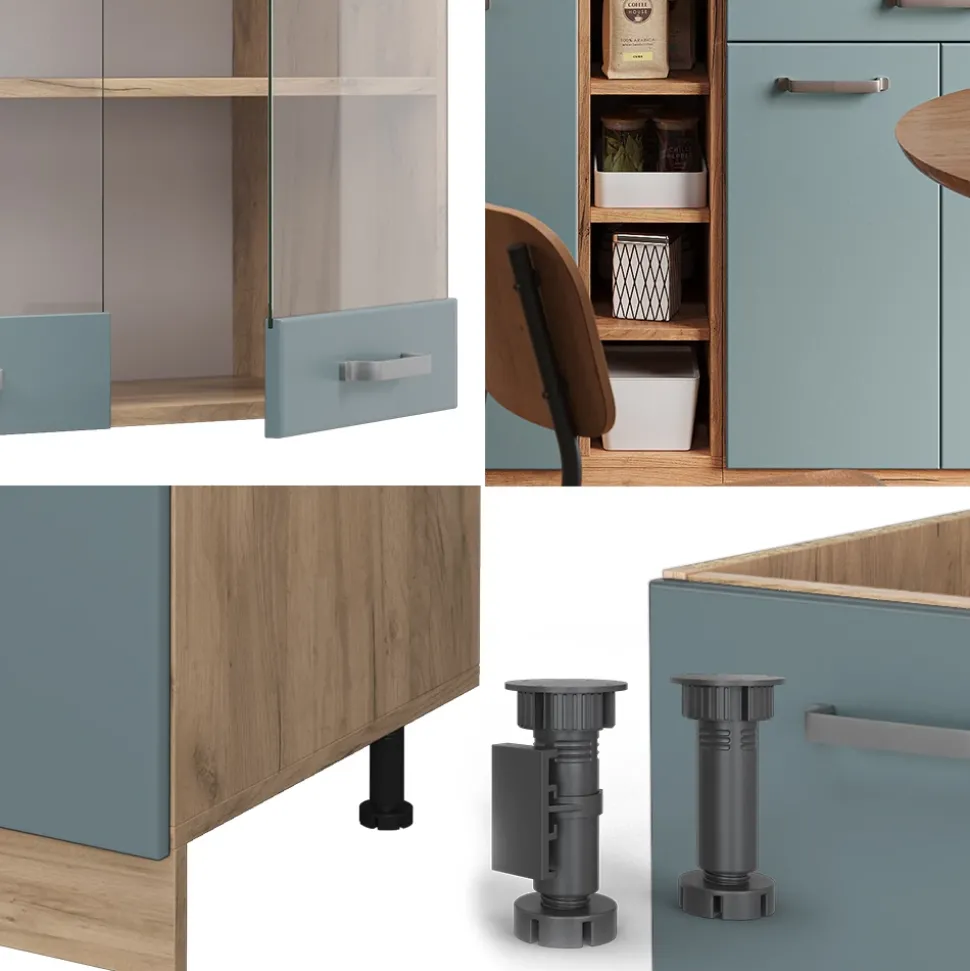 - Die Küchenzeile ist beliebig umstell- und erweiterbar. Mit höhenverstellbaren Füßen passt sie sich perfekt an jeden Raum an.