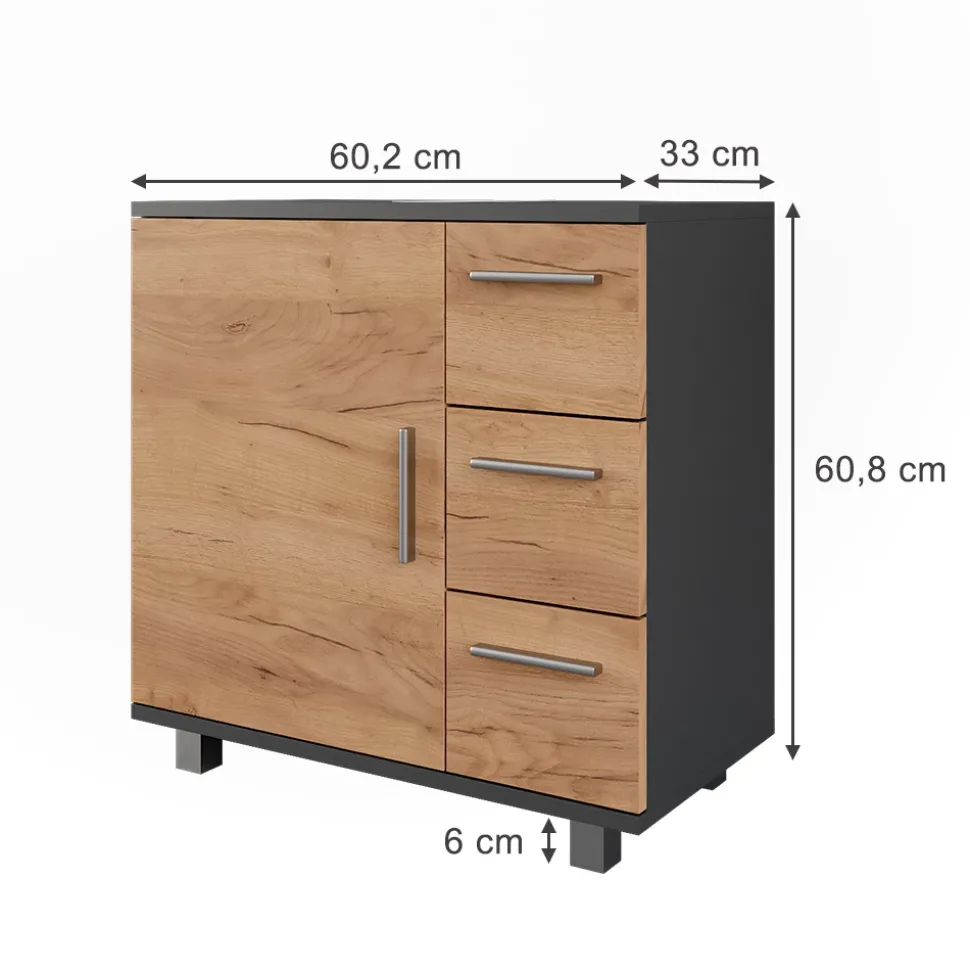 - MAßE: Der Unterschrank fürs Badezimmer hat folgende Abmessungen:Breite: 60 cm, Höhe: 61 cm, Tiefe: 33 cm. Alle weiteren Maßangaben findest du in den Produktbildern.