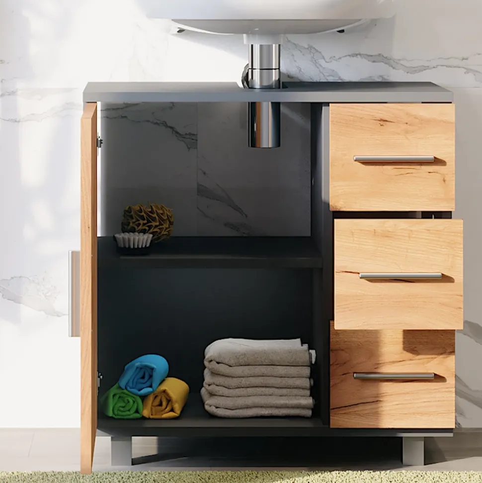 Mit dem Waschbeckenunterschrank der Serie Ilias liegen Sie für Ihr Bad garantiert richtig.Unser Waschbeckenunterschrank bietet viel Stauraum hinter der großen Tür und in den drei Schubladen. Der pflegeleichte, feuchtigkeitsbeständige Badschrank ist mit langlebigen Vollmetallscharnieren ausgestattet.Die formschönen Griffe in Alu-Optik runden das Gesamtbild perfekt ab. Dank der bebilderten Montageanleitung, die im Lieferumfang enthalten ist, gelingt der Aufbau im Handumdrehen!