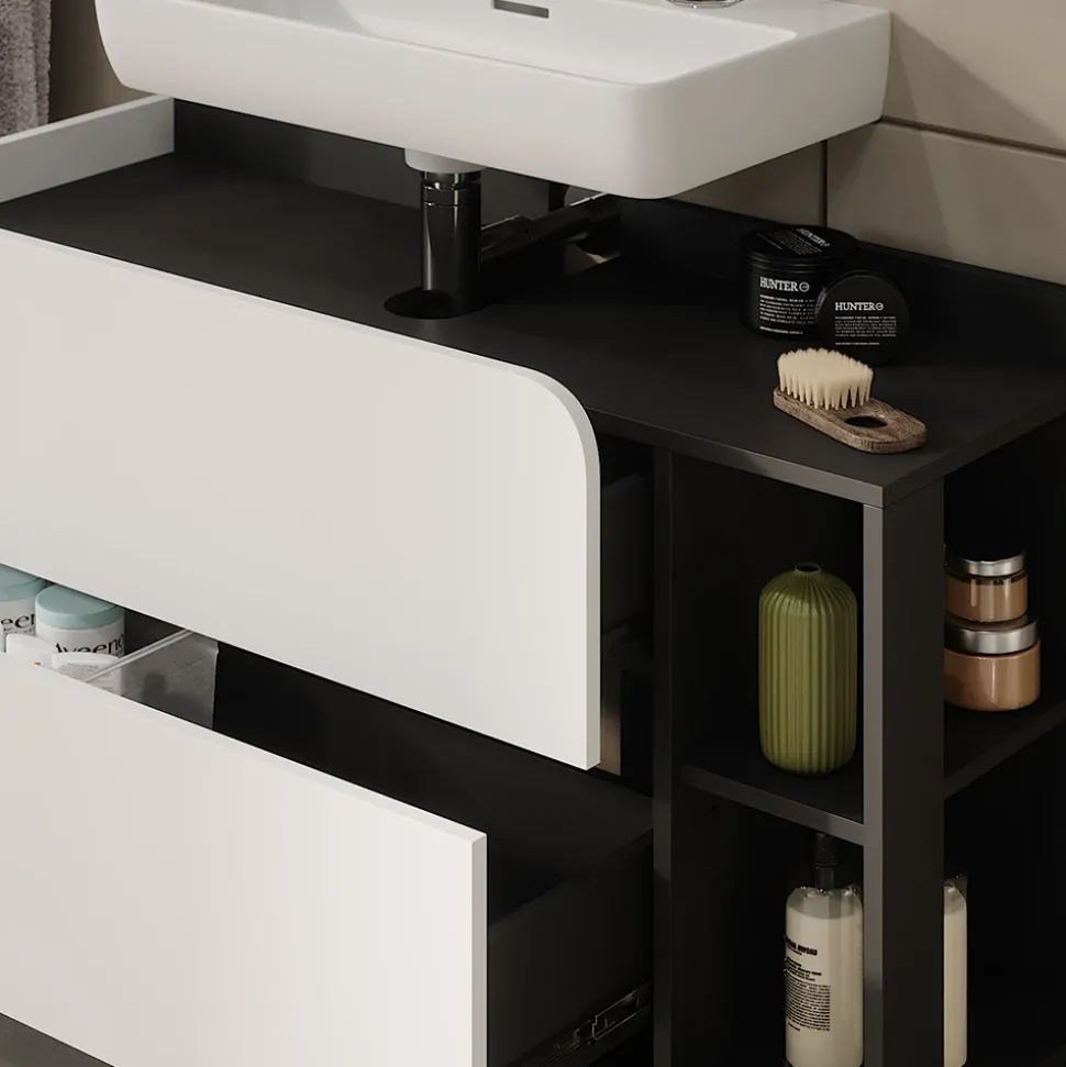 - Der Waschtischunterschrank mit Schubladen verfügt über 2 offene Fächer und 2 Schubladen, die sich per Push-to-open-Funktion bequem öffnen lassen.