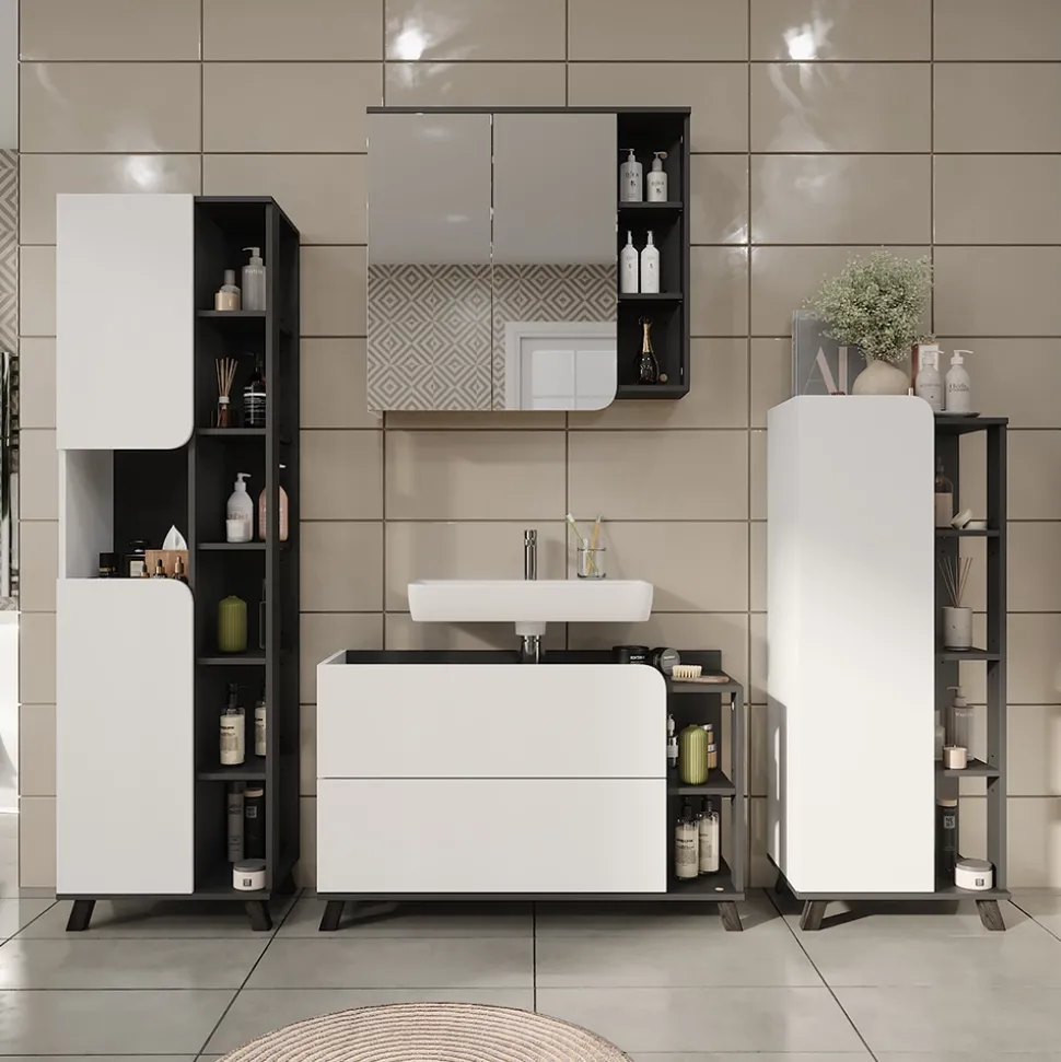 Die Möbelserie „Karen“ bietet eine umfangreiche Auswahl an Badezimmermöbeln, darunter Schränke, Spiegel und komplette Sets. Mit ihrem zeitgemäßen Design und hochwertigen Materialien schafft „Karen“ eine ästhetische und funktionale Umgebung in Ihrem Badezimmer, die sowohl Stil als auch praktischen Nutzen vereint.