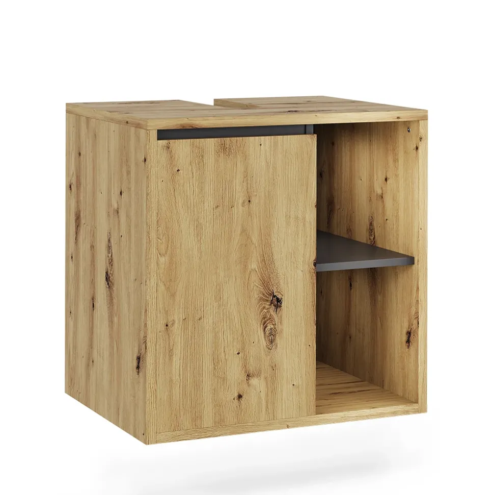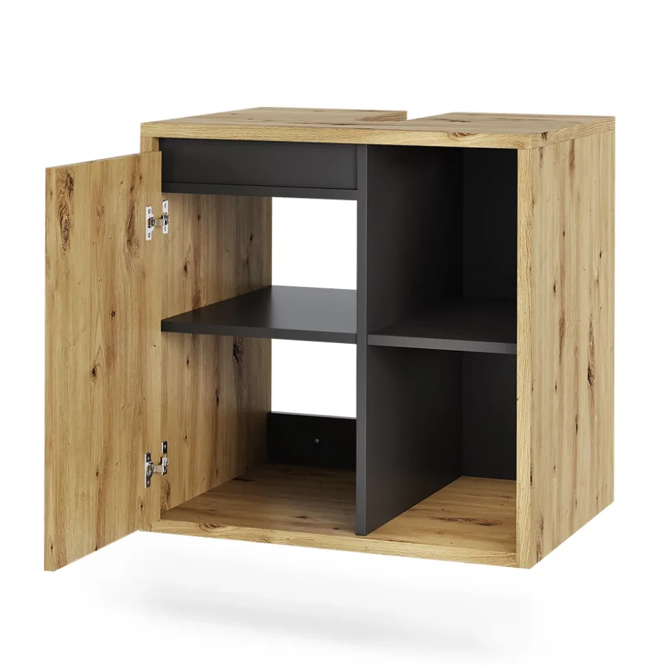 Der Waschbeckenunterschrank Viola kombiniert Funktionalität mit modernem Design. Mit einer Tür, zwei offenen und zwei geschlossenen Fächern bietet er praktischen Stauraum – ideal für kleine Badezimmer. Bringen Sie Stil und Ordnung in Ihr Bad mit Viola.