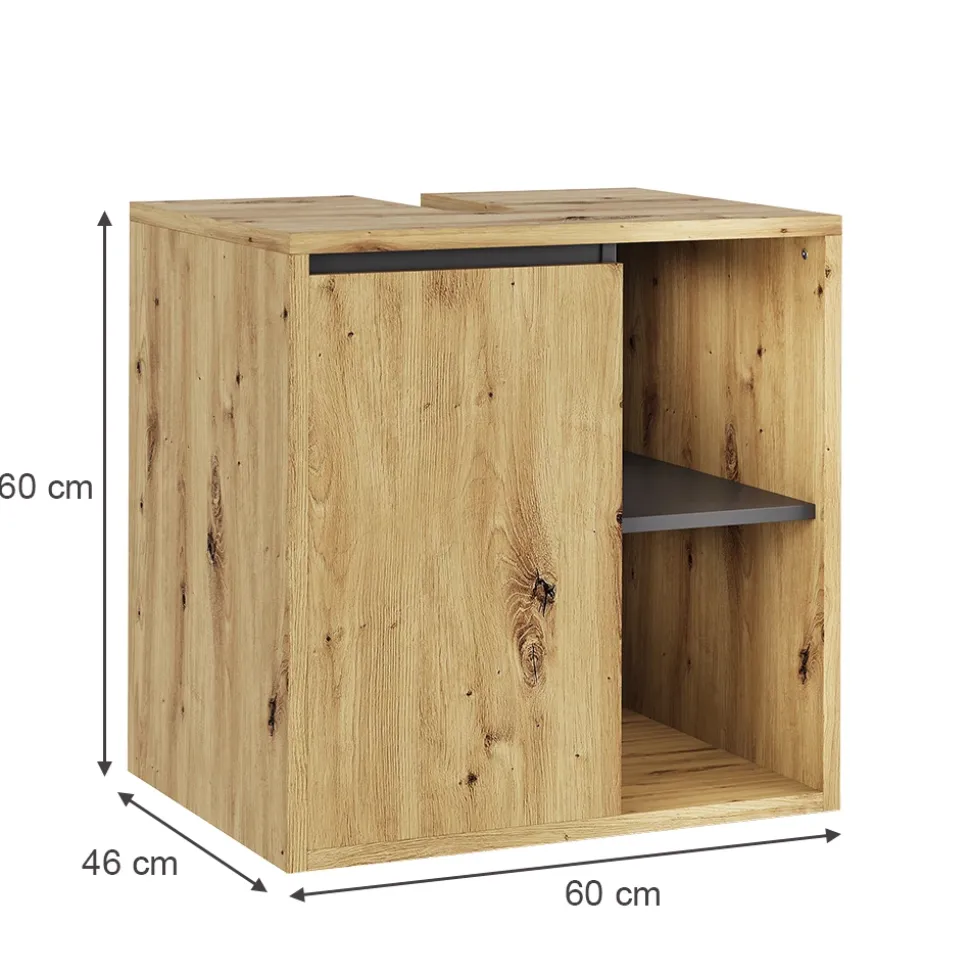 - MAßE: Der Unterschrank fürs Badezimmer misst 60 cm in der Breite, 60 cm in der Höhe und 46 cm in der Tiefe.