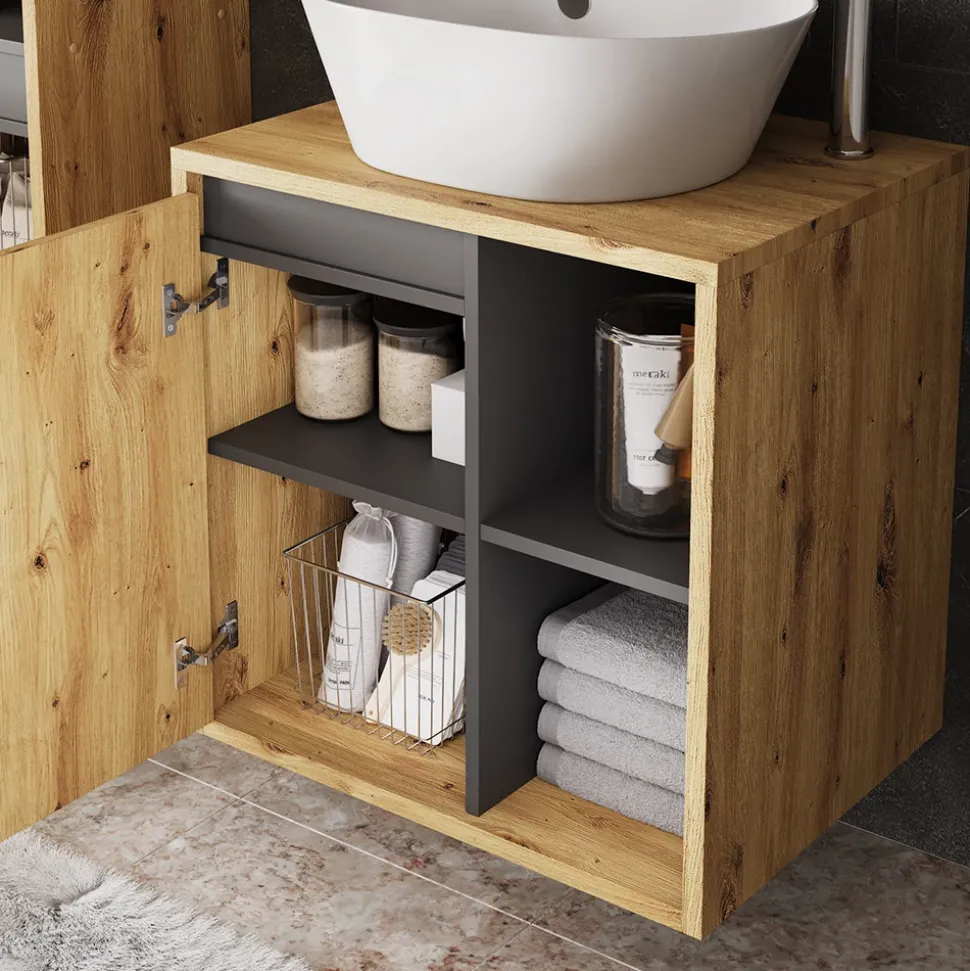- MATERIAL: Der Waschbeckenunterschrank besteht aus 16 mm starker, melaminbeschichteter Spanplatte – pflegeleicht und robust.