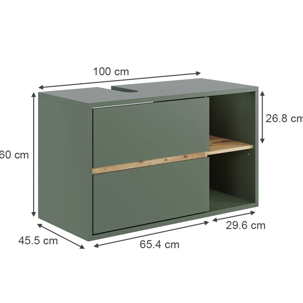 - MAßE: Der Unterschrank für das Badezimmer hat die Maße: Breite 100 cm, Höhe 60 cm, Tiefe 45,5 cm. Alle detaillierten Größen sind auf den Fotos ersichtlich.