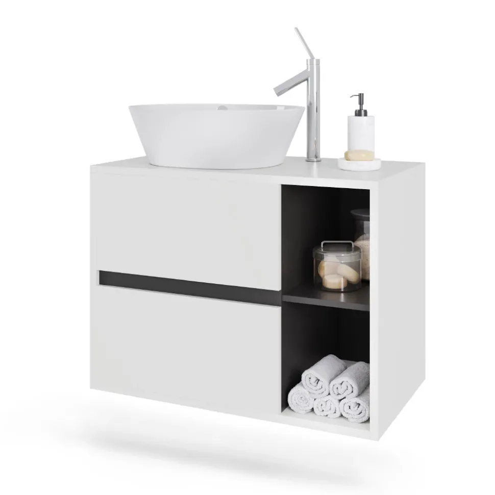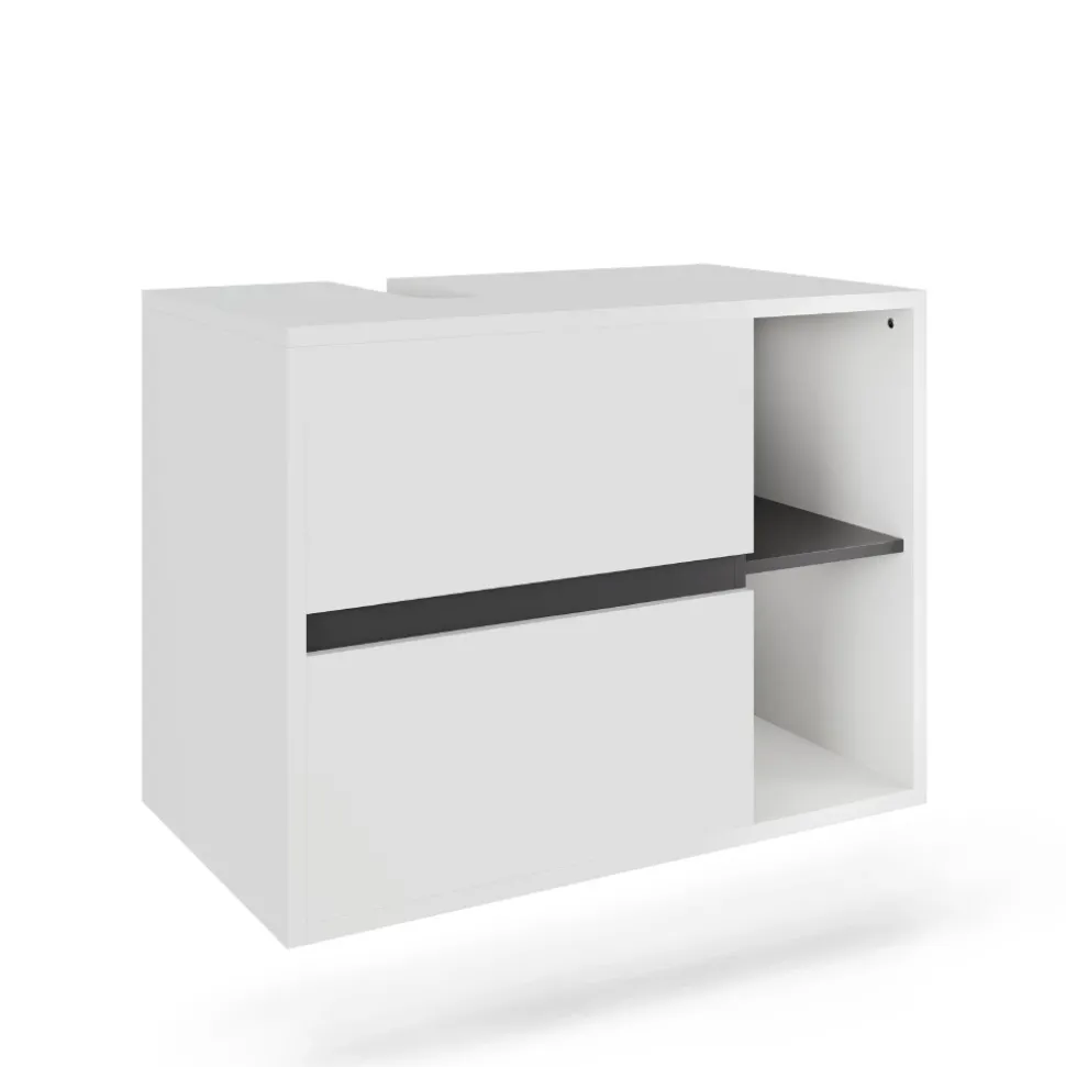 - Der Waschtischunterschrank verfügt über zwei Schubladen und zwei offene Fächer. Die Siphon-Aussparung ermöglicht eine platzsparende Wandmontage.