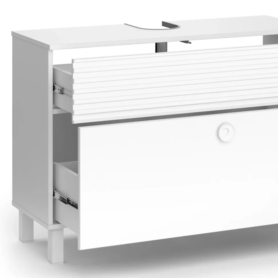 - Entdecken Sie den modernen Waschtischunterschrank Sola in Weiß, matt. Mit der praktischen „Push-to-Open“ – Funktion und reichlich Stauraum ist der Badschrank die ideale Ergänzung für Ihr Badezimmer.