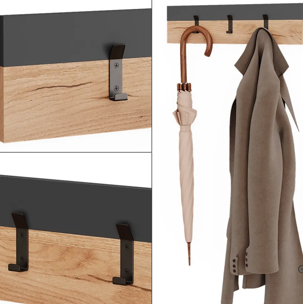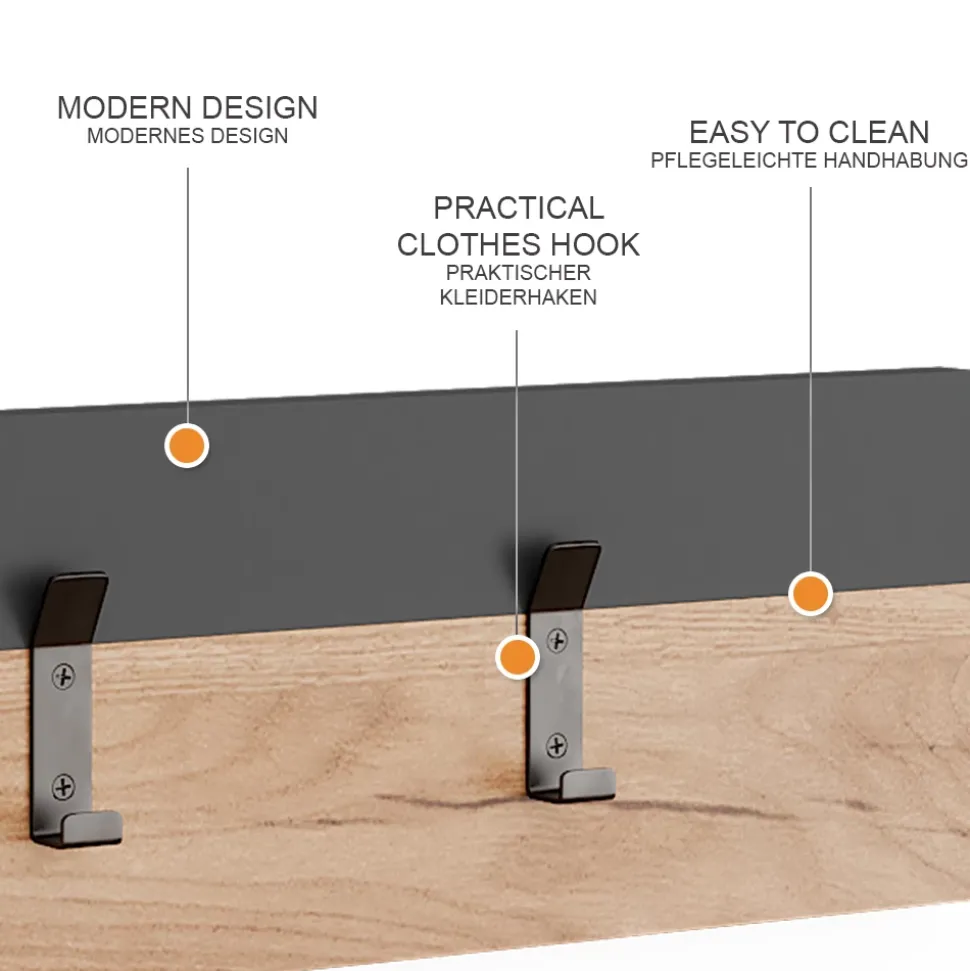 - MATERIAL: Die Wandgarderobe besteht aus einer pflegeleichten 16 mm Spanplatte. Einige Bestandteile des Artikels sind aus Metall gefertigt.