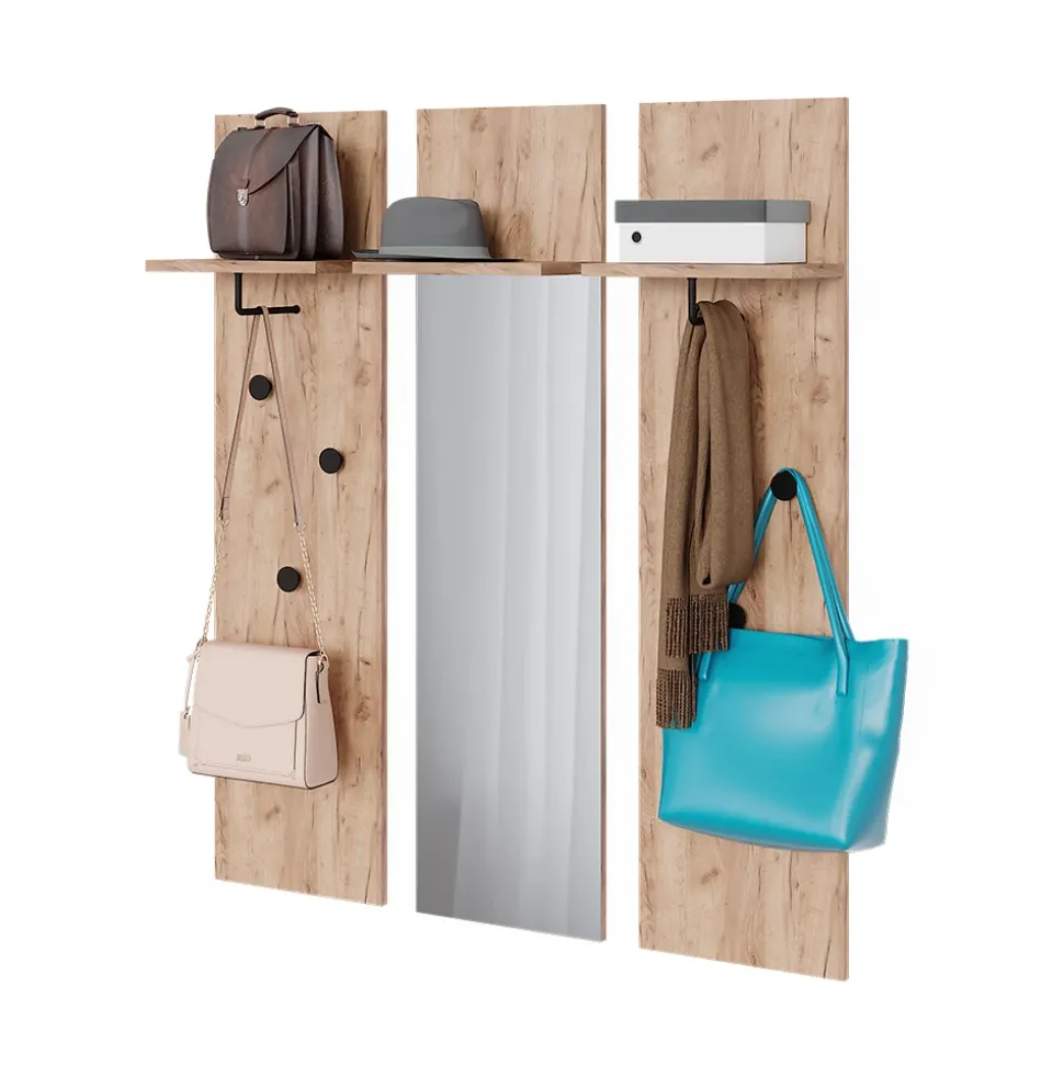 Die Wandgarderobe Siri ist die perfekte Lösung, um Ihren Flur ordentlich und stilvoll zu gestalten. Das Garderobenset bietet Ihnen genügend Platz für Jacken, Mäntel und Accessoires.. Der Wandspiegel dient nicht nur als praktisches Utensil beim Verlassen des Hauses, sondern auch als dekoratives Element, das Ihrem Flur eine persönliche Note verleiht. Mit der Flurgarderobe wird Ihr Eingangsbereich zu einem einladenden und organisierten Raum, der Ihren Gästen sofort ein Gefühl von Wärme und Gastfreundschaft vermittelt.