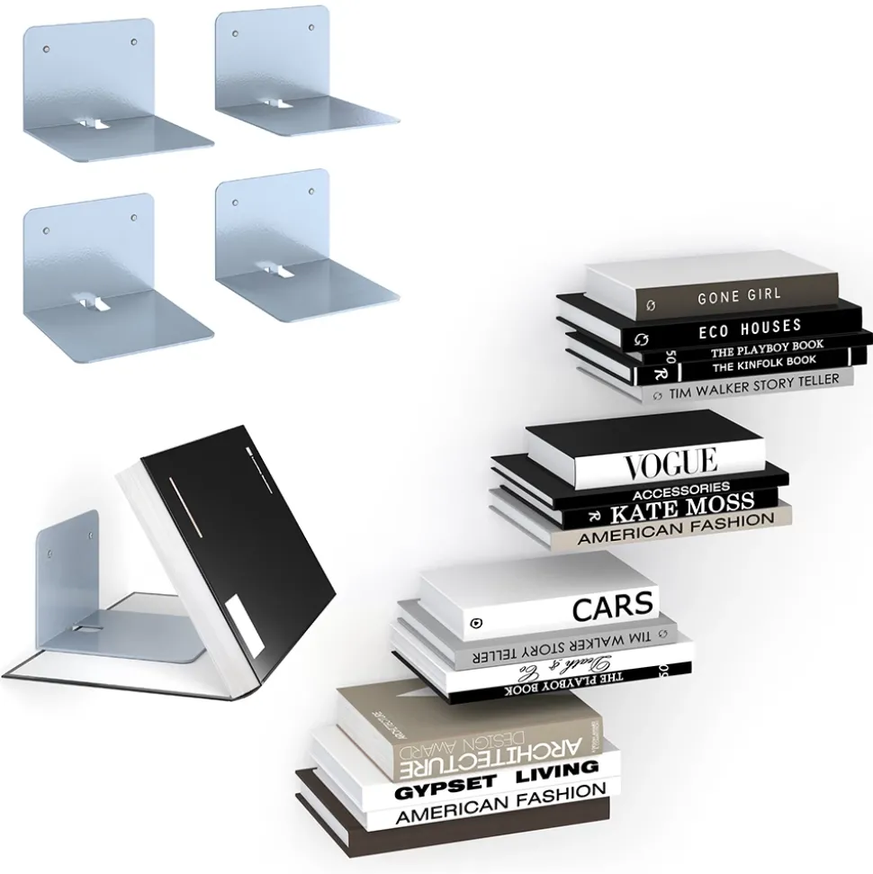 - Das Regal für Bücher ist an der Wand montierbar und bietet vier offene Regale für reichlich Stauraum. In Silber gehalten, passt es zu jeder Einrichtung.
