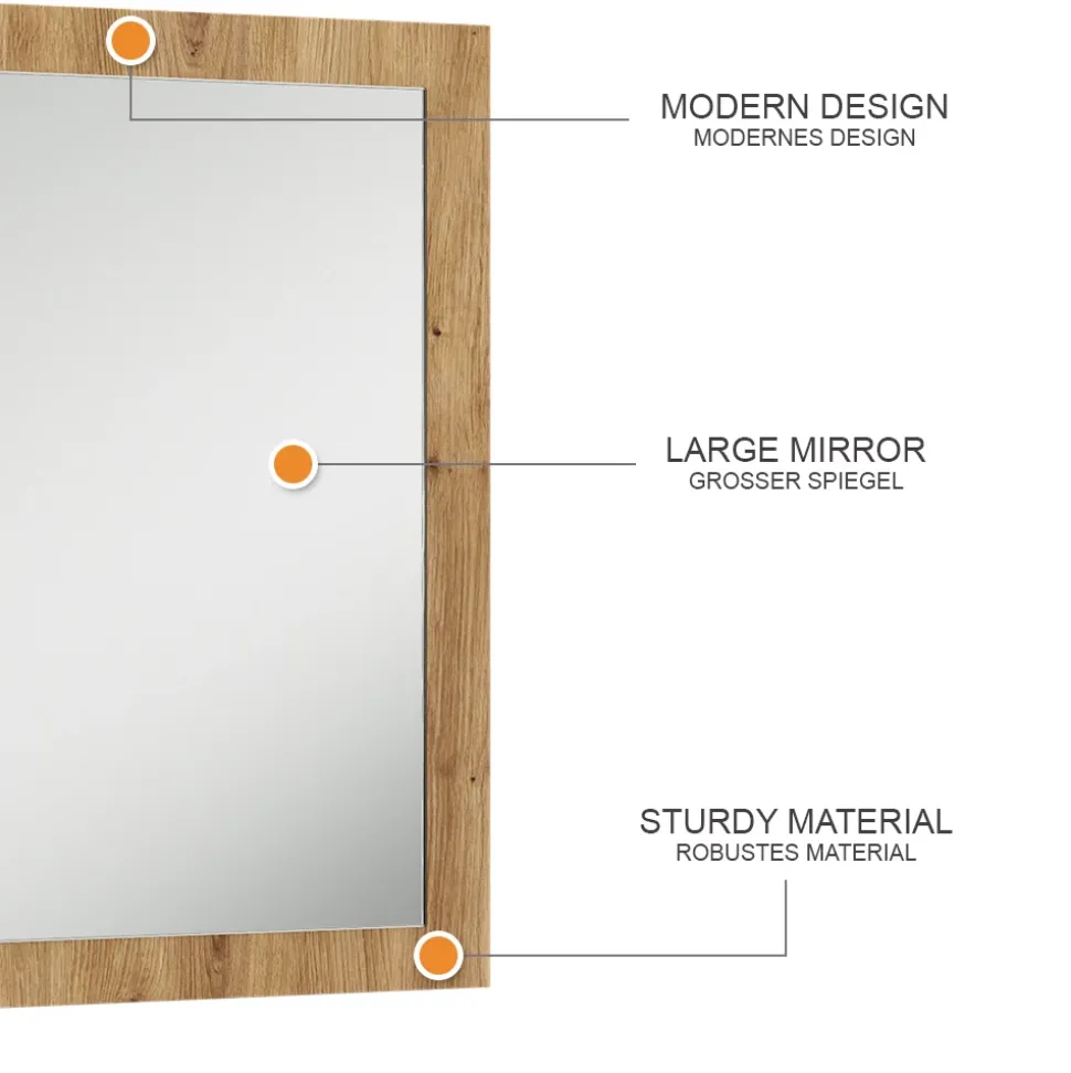 - MATERIAL: Der Rahmen besteht aus pflegeleichter, melaminharzbeschichteter 16 mm Spanplatte. Der Spiegel besteht aus Glas.