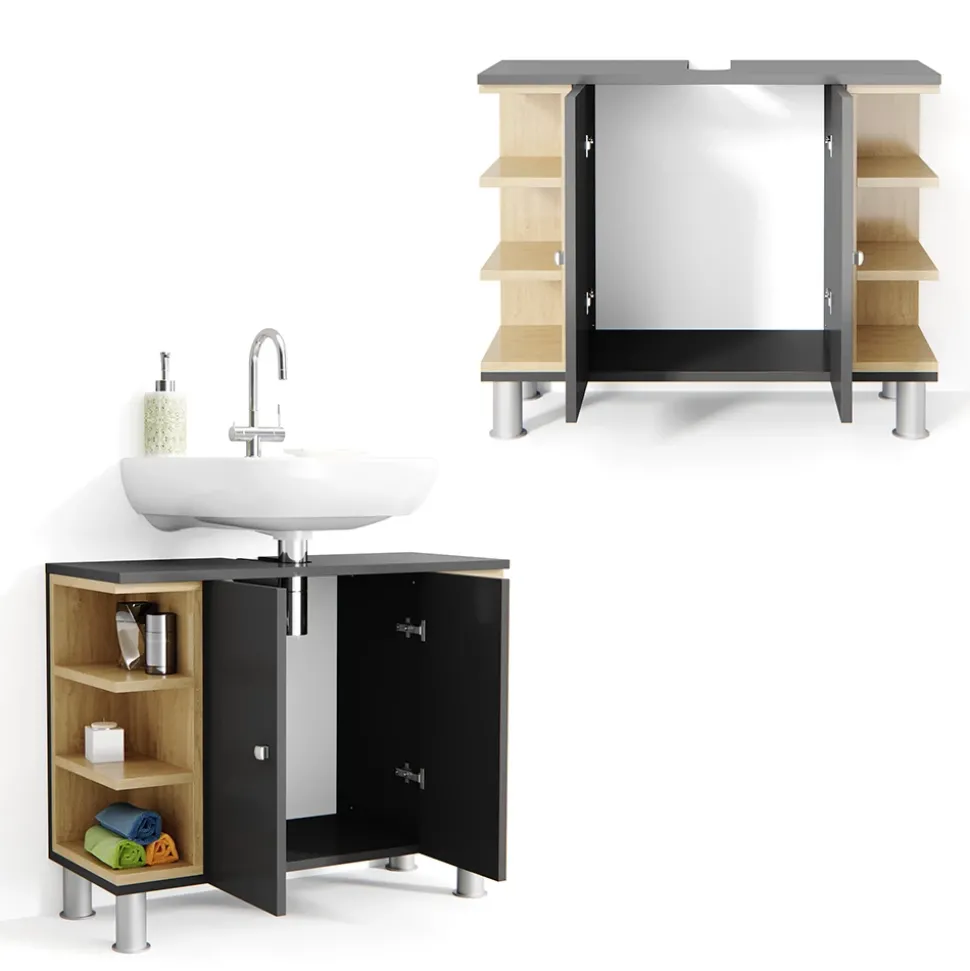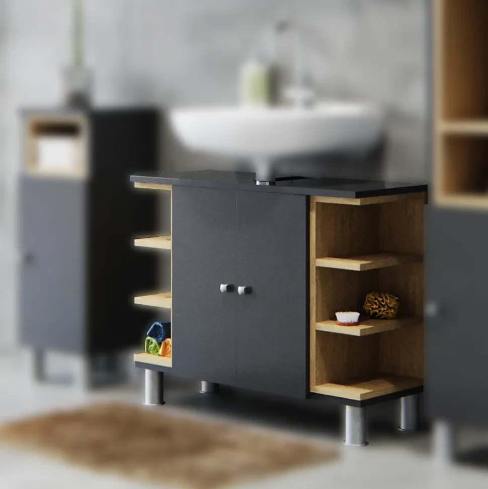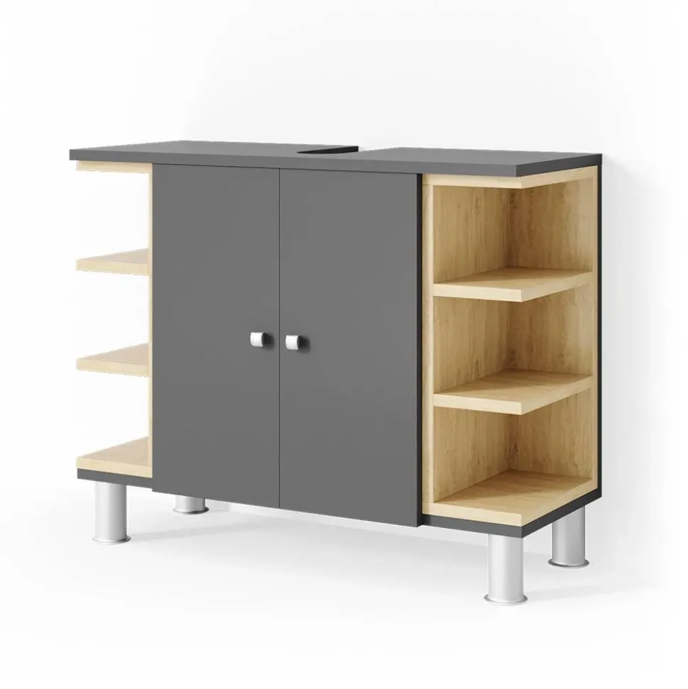 - Der Waschtischunterschrank hat zwei Flügeltüren und sechs offene Einlegeböden. Für einen Siphon ist eine Aussparung vorhanden. Die Füße des Möbelstücks sind aus Metall.