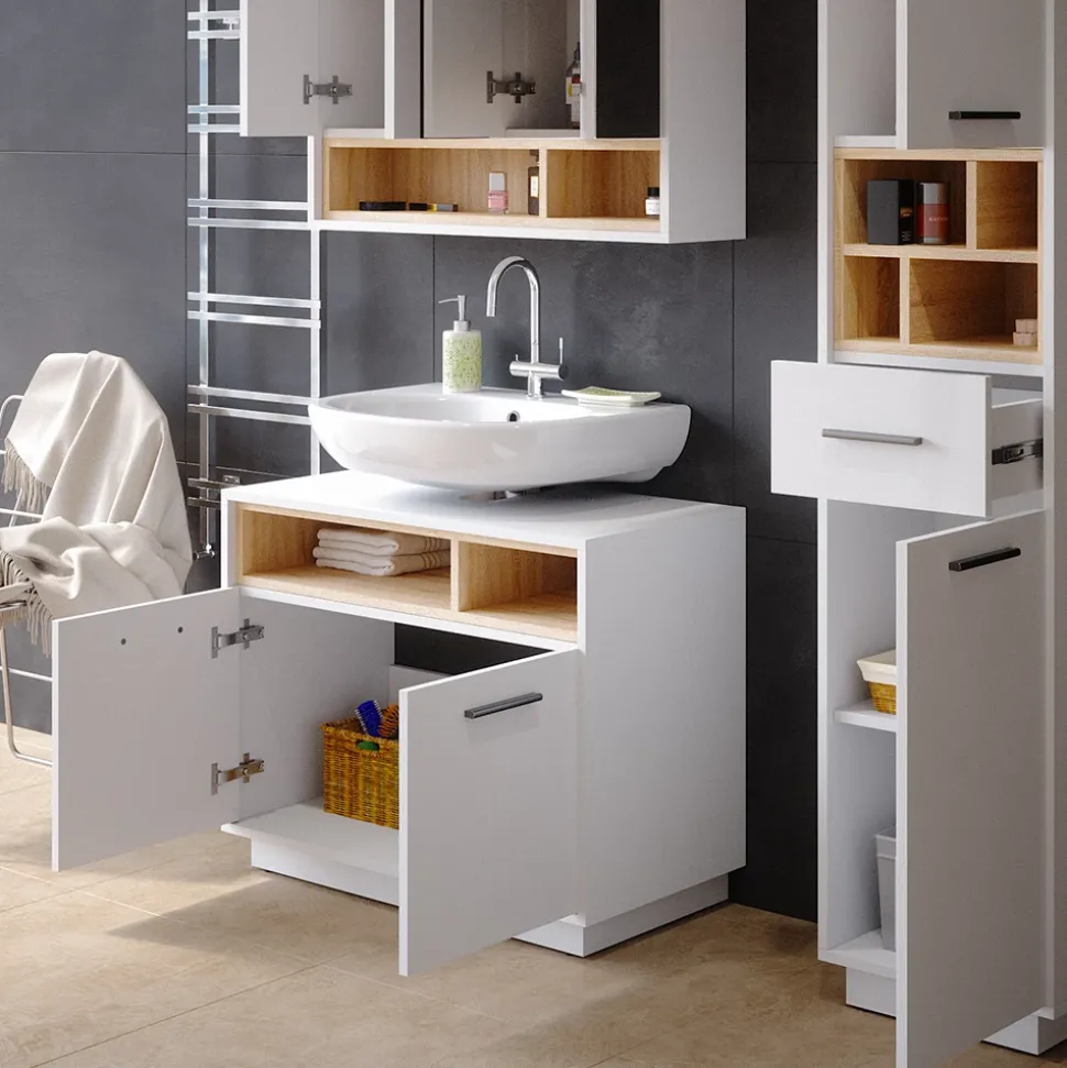 - Der Waschtischunterschrank hat zwei Flügeltüren und 2 offene Ablageflächen. Es gibt eine Aussparung für einen Siphon, reichlich Stauraum.