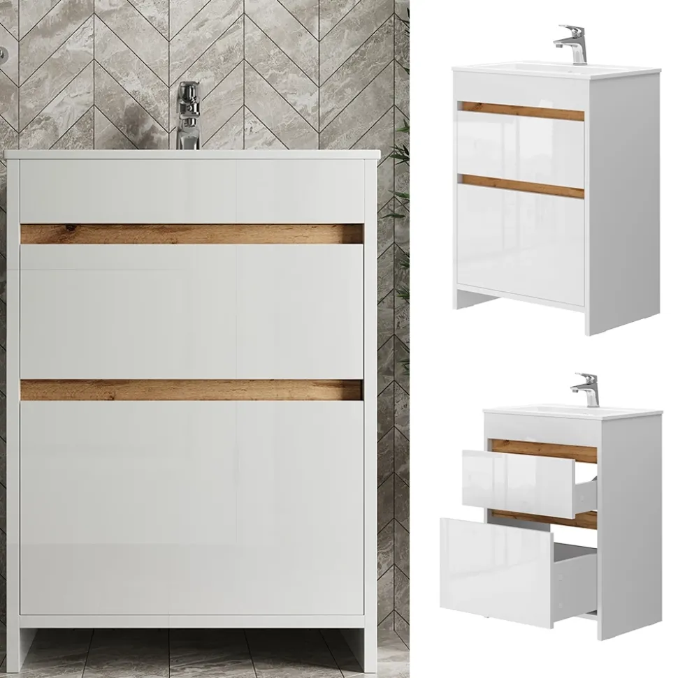 Schubladen mit „Häfele“-Soft-Close-Scharnieren: Erleben Sie sanftes Schließen und ein Höchstmaß an Komfort bei jedem Zugriff. Durch die edle Hochglanzfront verleihen Sie Ihrem Badezimmer einen Hauch von Eleganz und zeitlosem Stil. Mit dem inklusiven Waschbecken erhalten Sie eine praktische Komplettlösung, sparen Zeit bei der Auswahl und genießen ein komfortables Rundum-Paket. Mit der pflegeleichten Oberfläche erleichtern Sie sich das Leben, denn sie ist einfach zu reinigen und zu pflegen.