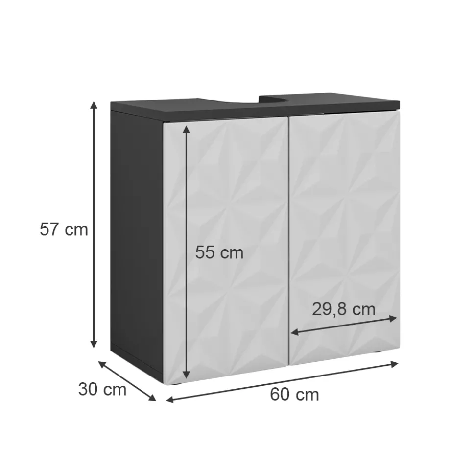 - MAßE: Der Unterschrank für das Badezimmer hat folgende Abmessungen: Breite: 60 cm, Höhe: 57 cm, Tiefe: 30 cm. Alle detaillierten Größen sind auf den Fotos angegeben.
