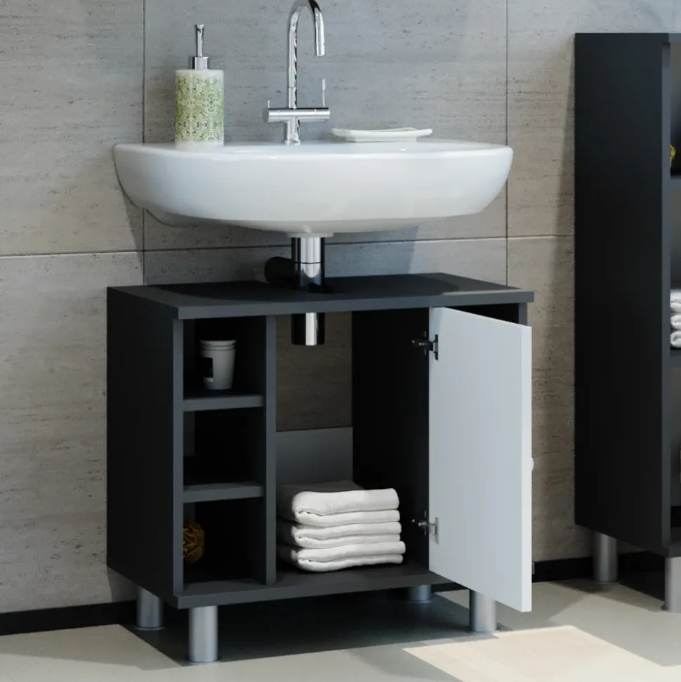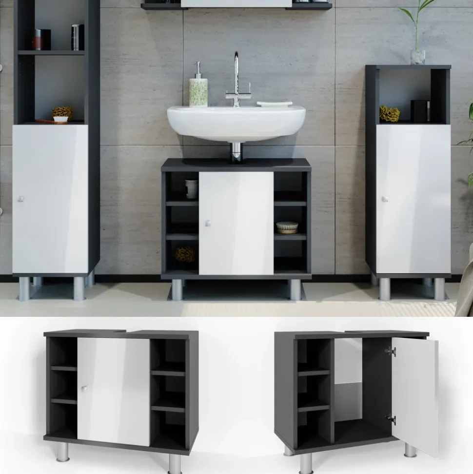 - Der Waschtischunterschrank hat eine Flügeltür und 6 offene Einlegeböden. Es gibt eine Aussparung für einen Siphon. Metallfüße sorgen für Standfestigkeit.
