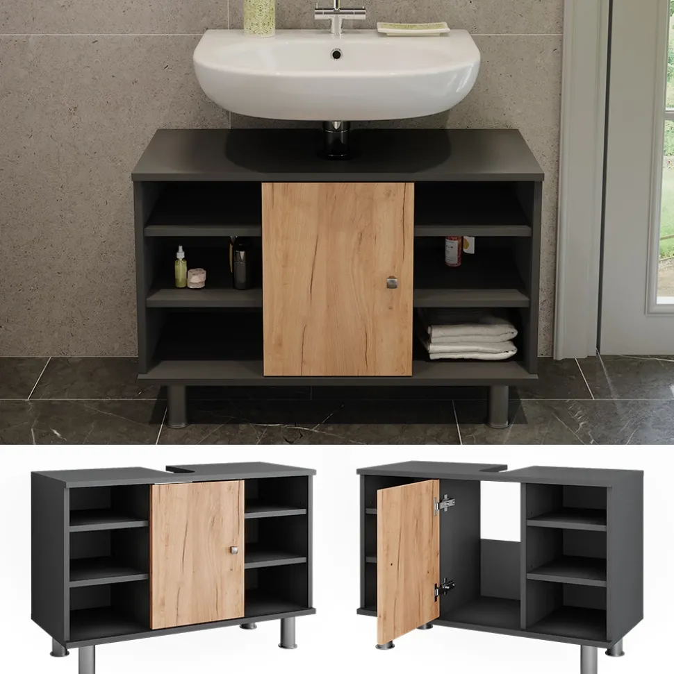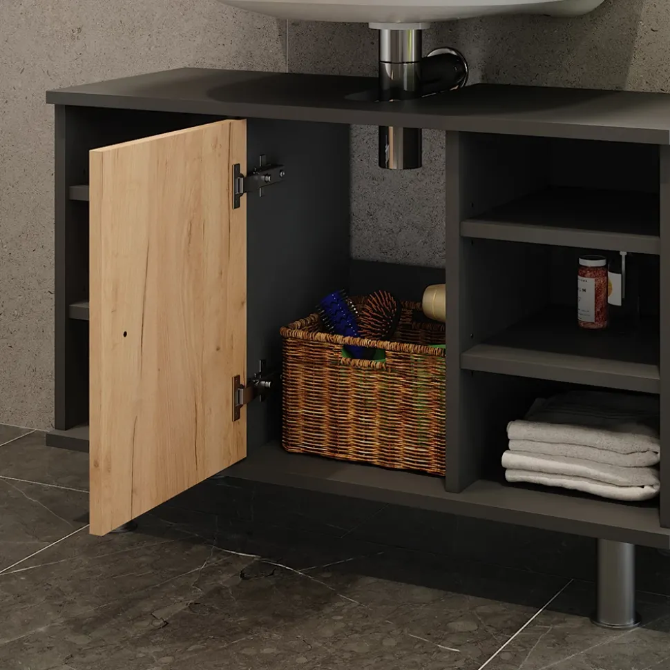 - Der Waschtischunterschrank verfügt über eine Flügeltür und 6 offene Einlegeböden. Mit einer Aussparung für den Siphon ist er kompatibel mit anderen Produkten der Kollektion Fynn.