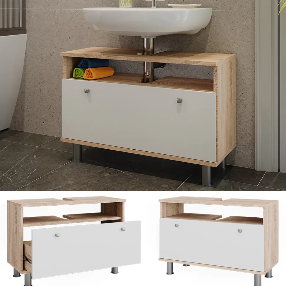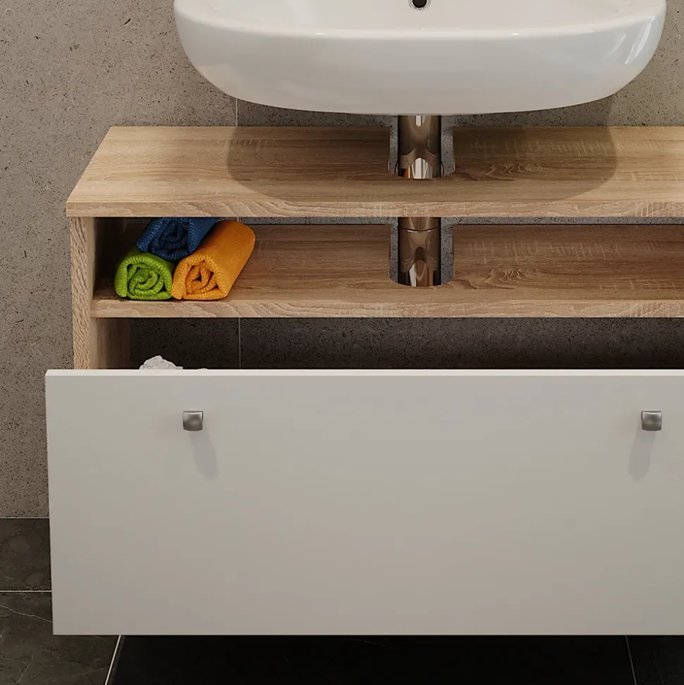 - Der Waschtischunterschrank mit Schublade bietet viel Stauraum dank seiner großen Schublade. Er ist platzsparend und funktional gestaltet, ideal für jedes Badezimmer.