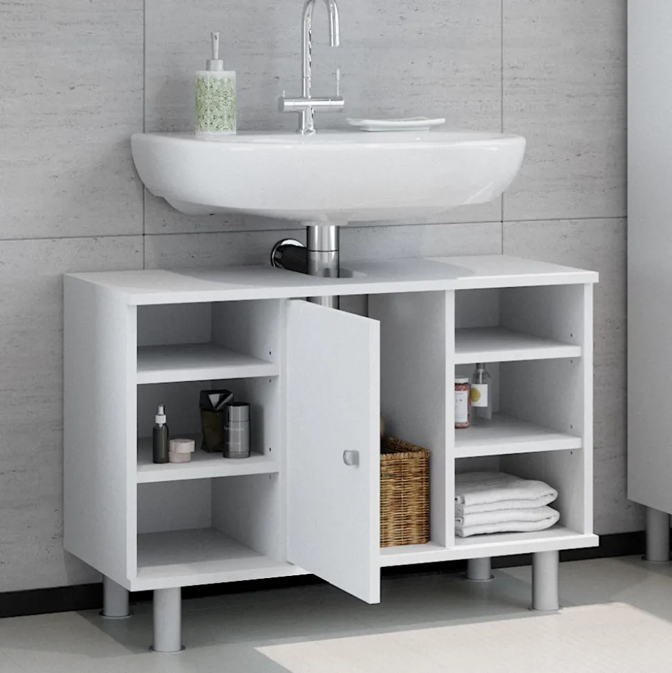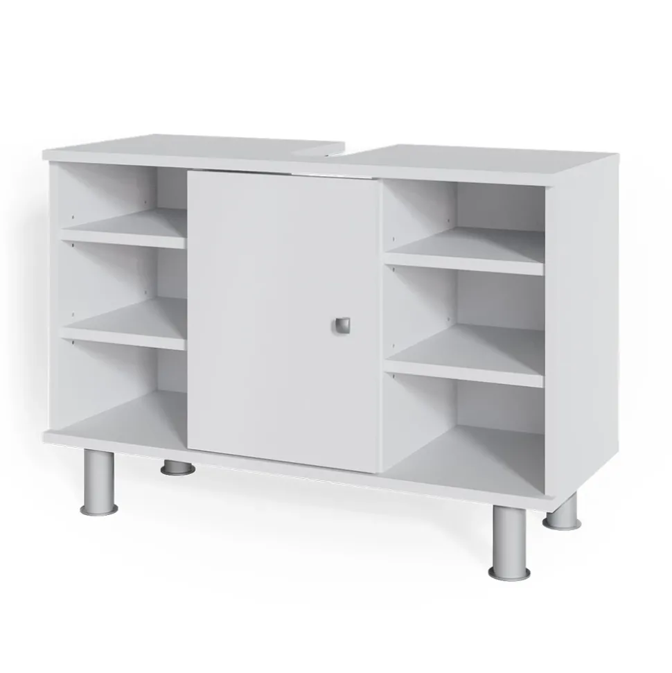 - Der Waschtischunterschrank verfügt über eine Flügeltür und 6 offene Einlegeböden. Mit einer Aussparung für den Siphon ist er kompatibel mit anderen Produkten der Kollektion Fynn.