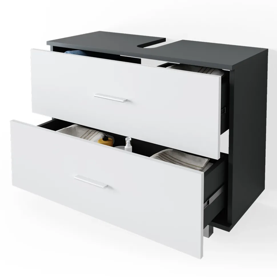 - Der Waschtischunterschrank mit Schubladen bietet viel Stauraum mit zwei großen Schubladen und einer Aussparung für den Siphon.