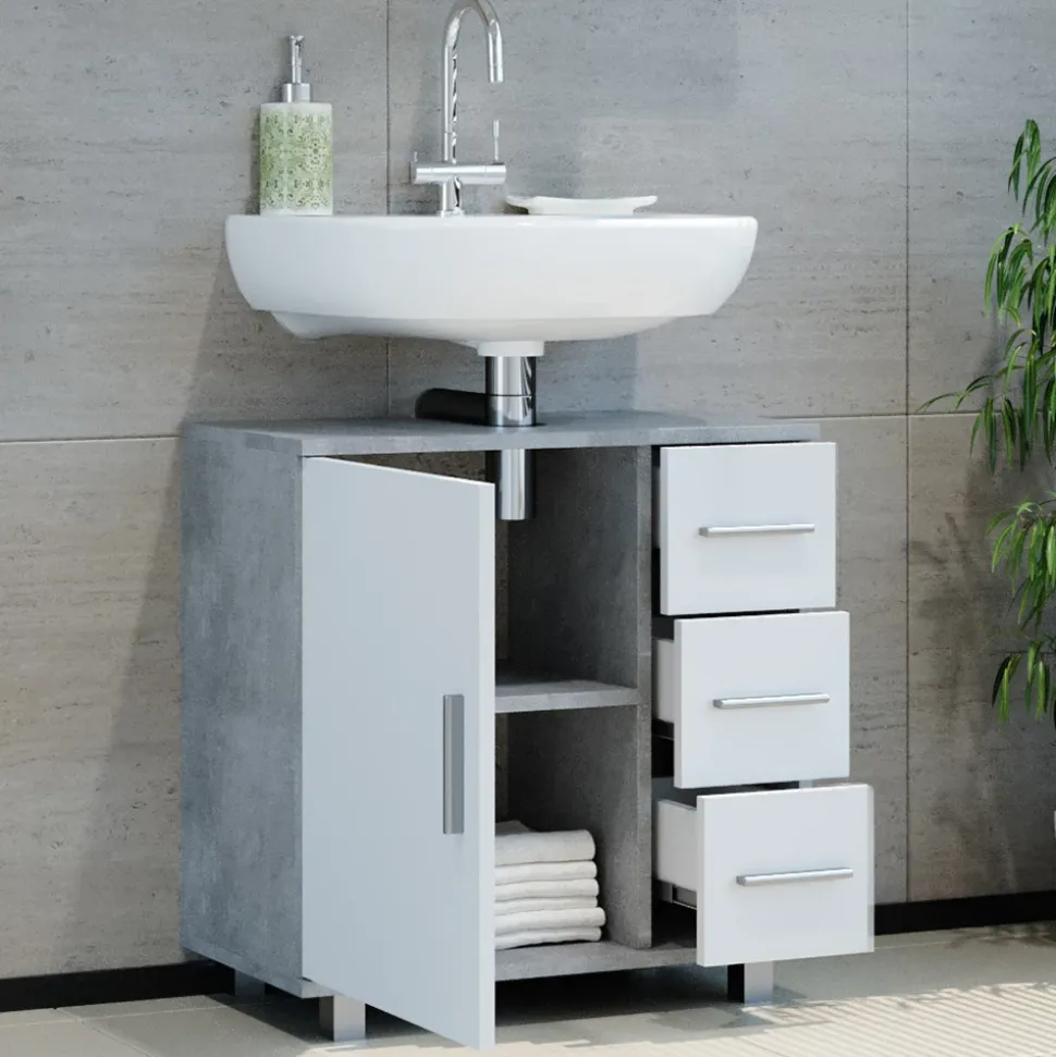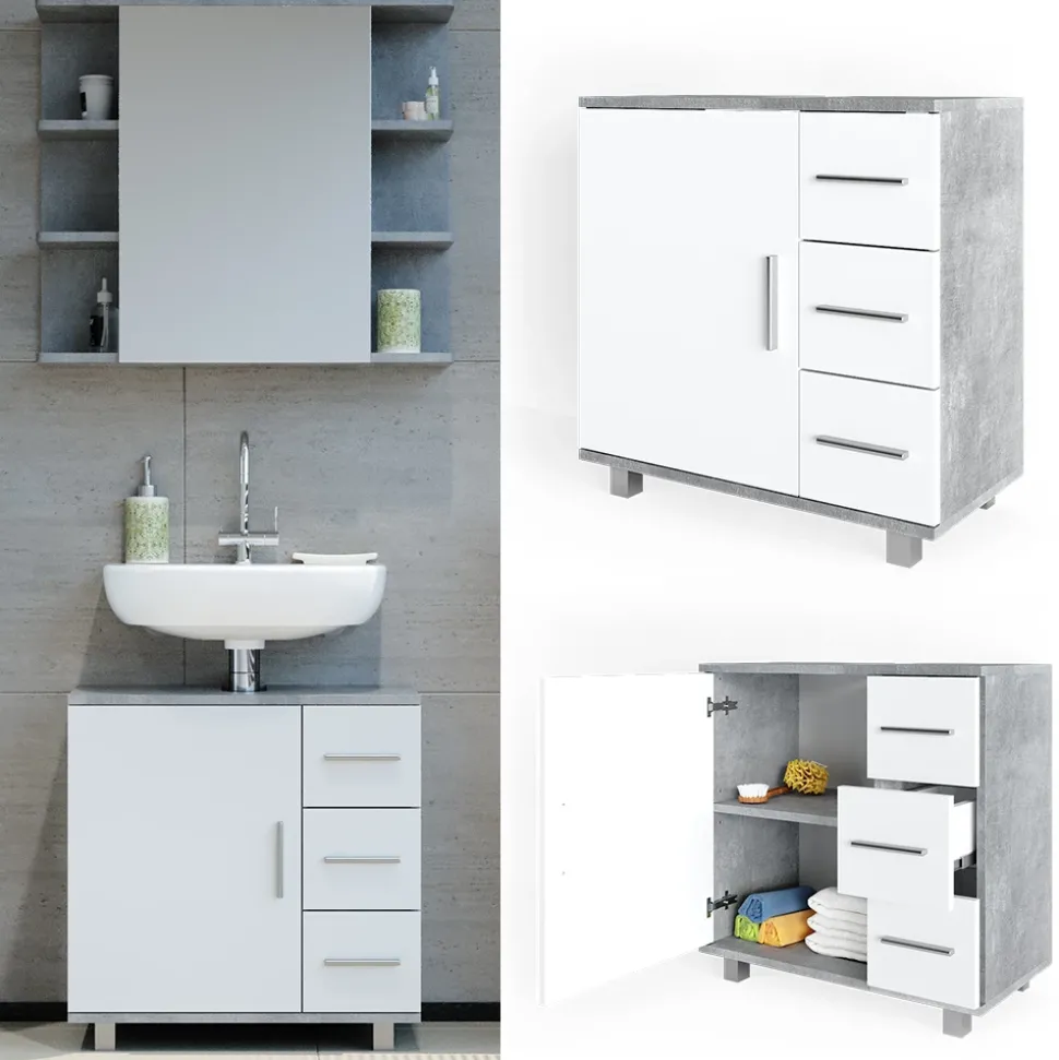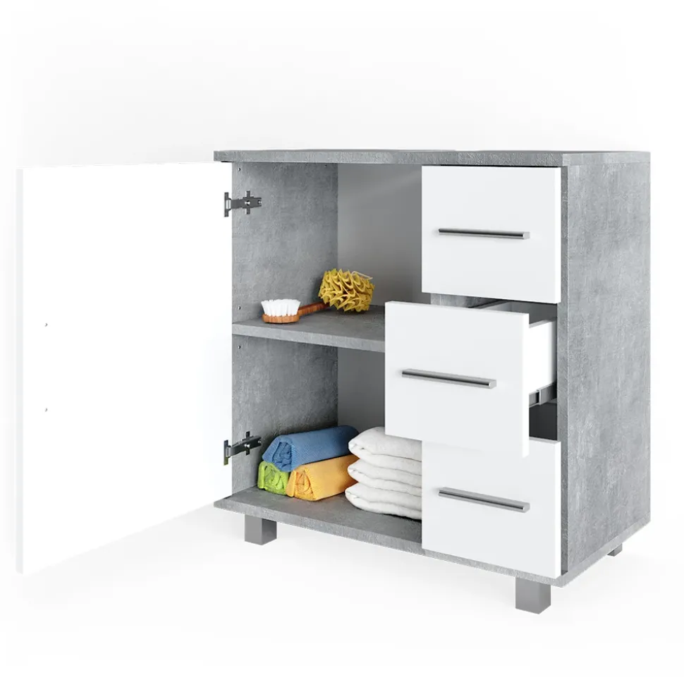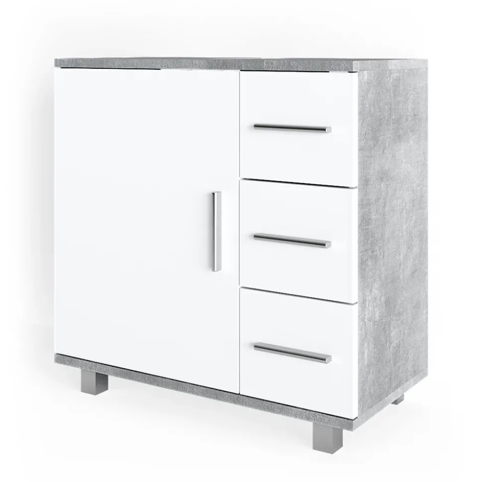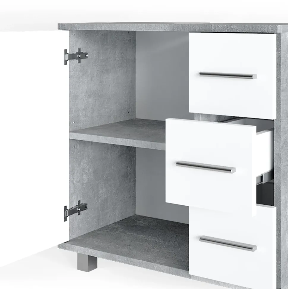 - Der Waschtischunterschrank mit Schubladen bietet eine perfekte Aufbewahrungslösung für Badezimmer. Mit Flügeltür und 3 Schubladen, sowie Aussparung für Siphon.