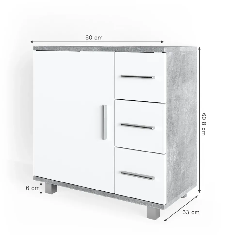 - MAßE: Der Unterschrank Badezimmer hat eine Breite von 60 cm, eine Höhe von 60,8 cm und eine Tiefe von 33 cm. Alle detaillierten Größen sind auf den Fotos angegeben.