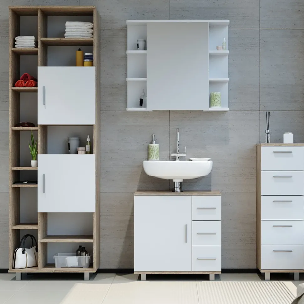 - MATERIAL: Der Badunterschrank besteht aus pflegeleichter Spanplatte 16 mm, mit einer Melaminharzbeschichtung