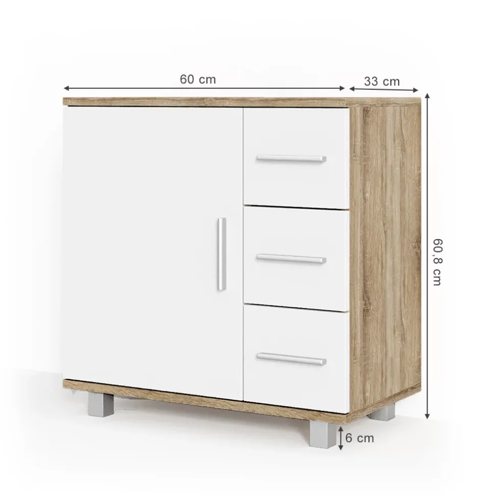 - MAßE: Der Unterschrank Badezimmer hat eine Breite von 60 cm, eine Höhe von 60,8 cm und eine Tiefe von 33 cm. Alle detaillierten Größen sind auf den Fotos angegeben.