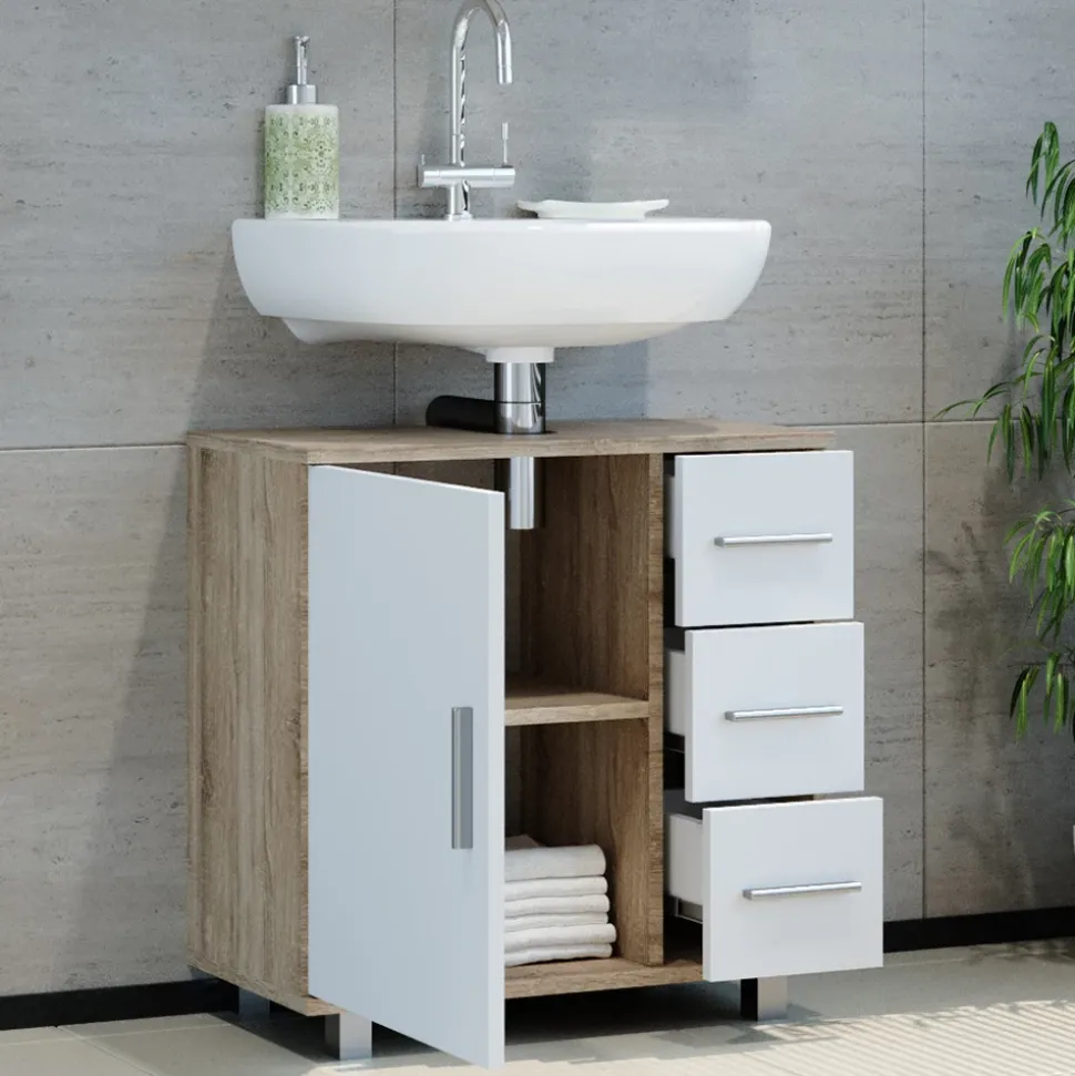 Ein Hingucker für Ihr Badezimmer – der Waschbeckenunterschrank Ilias. Der Unterschrank ist aus hochwertigen Materialien gefertigt und bietet dank seines funktionellen Designs viel Stauraum. Der Waschtischunterschrank hat eine Flügeltür und drei Schubladen. In der kompakten Unterschrank ist auch Platz für einen Siphon. Der Waschbeckenunterschrank ist kompatibel mit anderen Artikeln der Kollektion Ilias und ein echter Blickfang für Ihr Badezimmer.