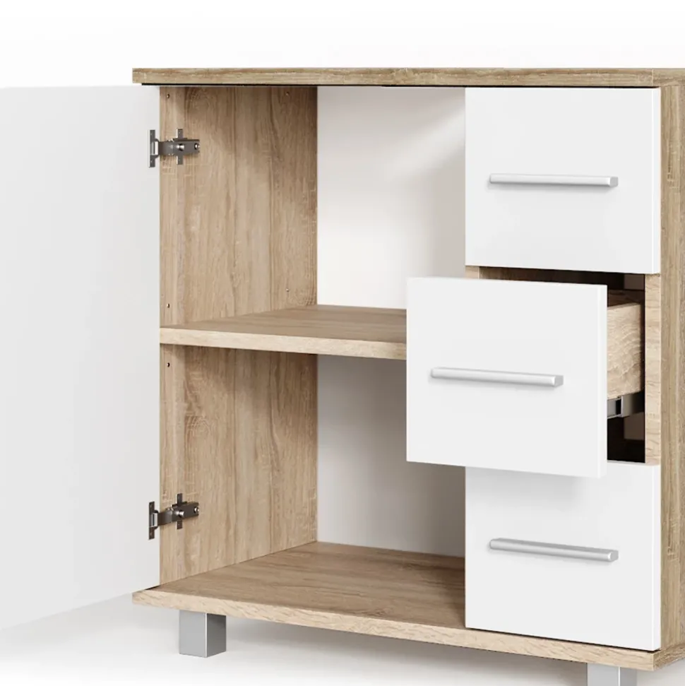 - Der Waschtischunterschrank mit Schubladen bietet eine perfekte Aufbewahrungslösung für Badezimmer. Mit Flügeltür und 3 Schubladen, sowie Aussparung für Siphon.