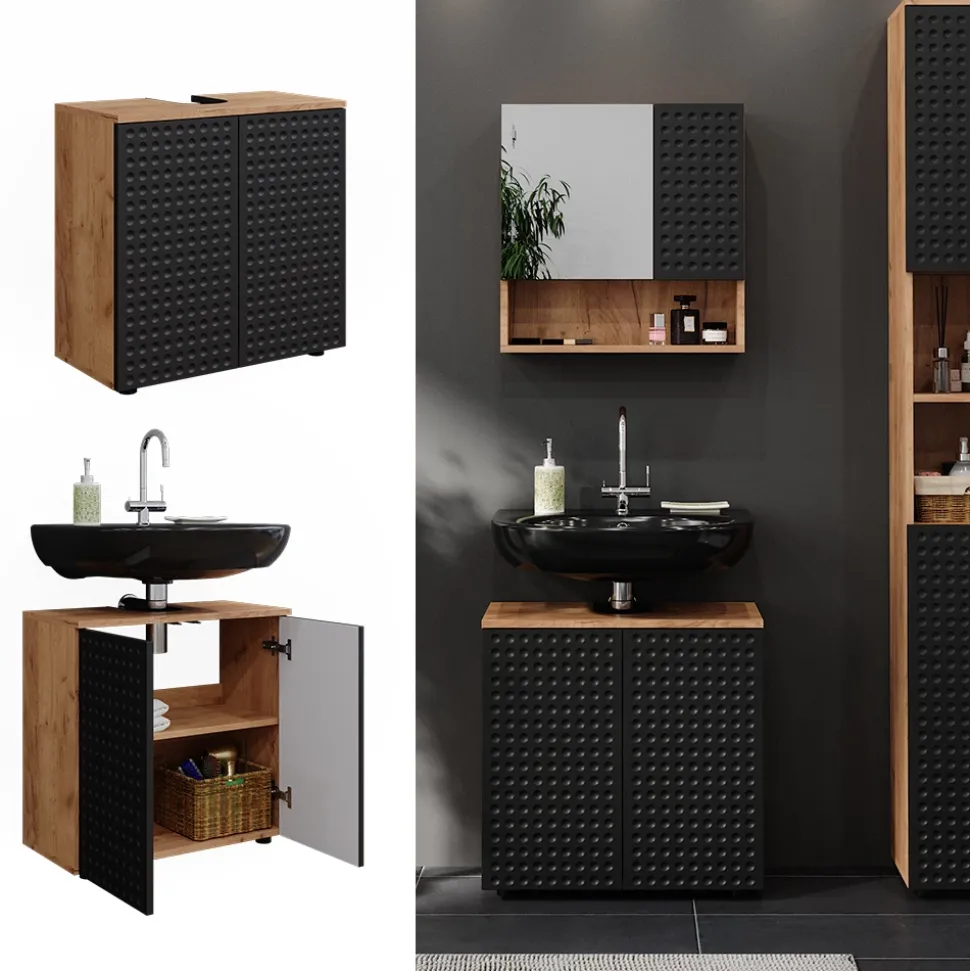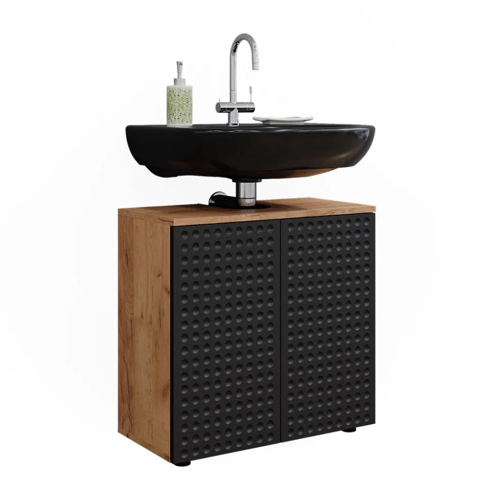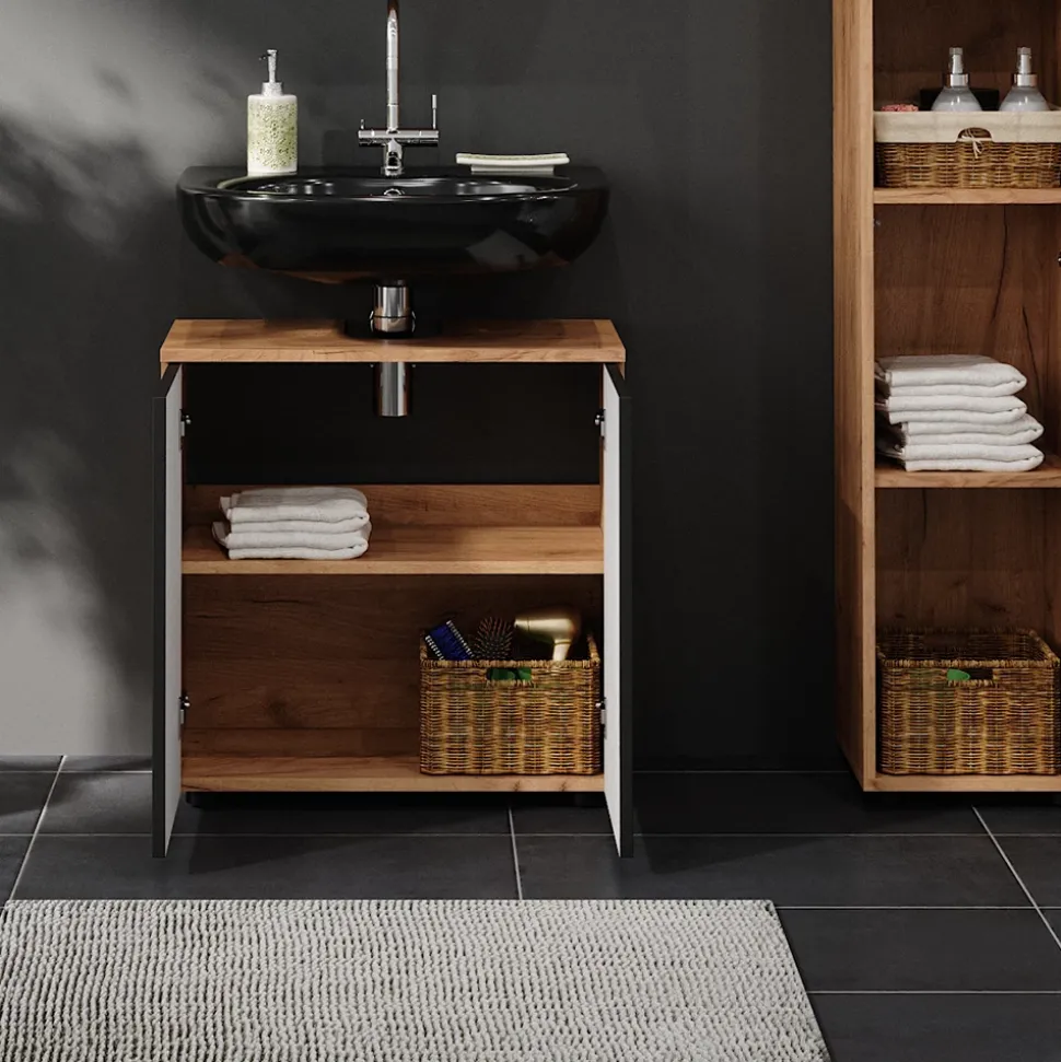 - Dieser Waschbeckenunterschrank bietet viel Stauraum hinter zwei Flügeltüren und hat eine praktische Aussparung für den Siphon. Ein praktisches Möbelstück für das Badezimmer.