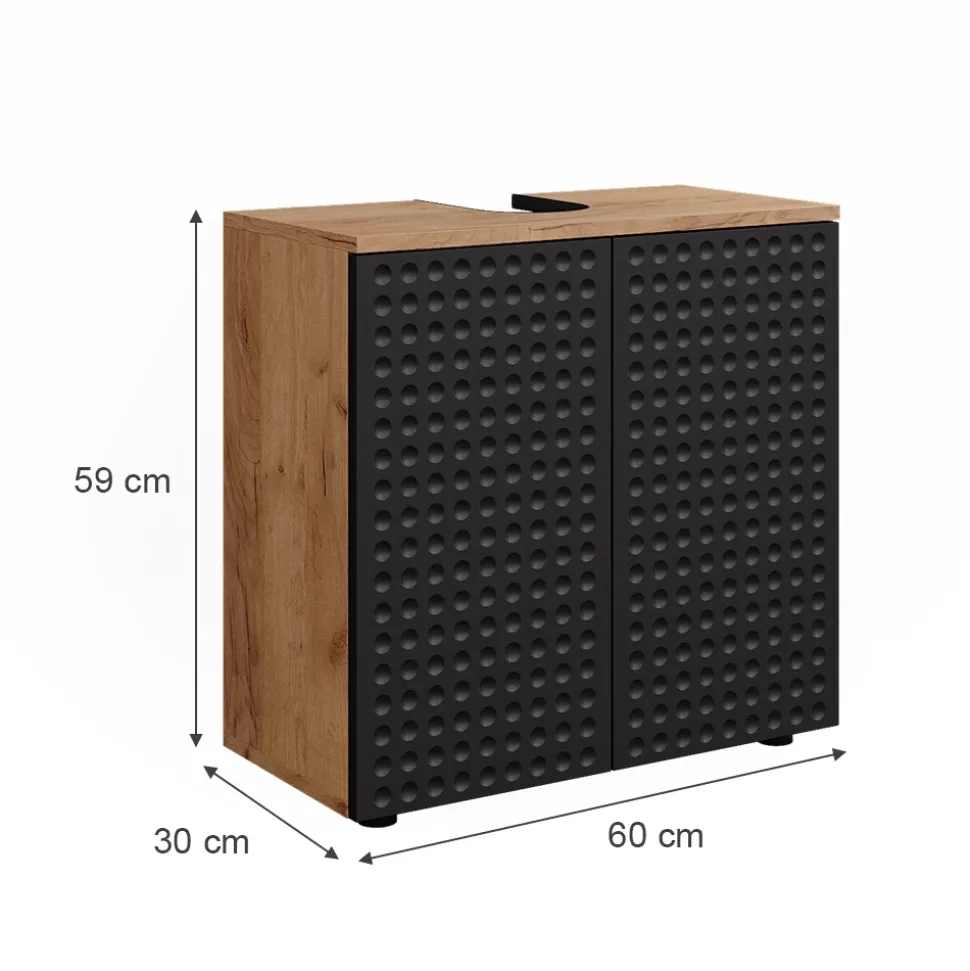 - MAßE: Der Unterschrank für das Badezimmer ist 60 cm breit, 59 cm hoch und 30 cm tief. Alle detaillierten Maße sind auf den Fotos angegeben.