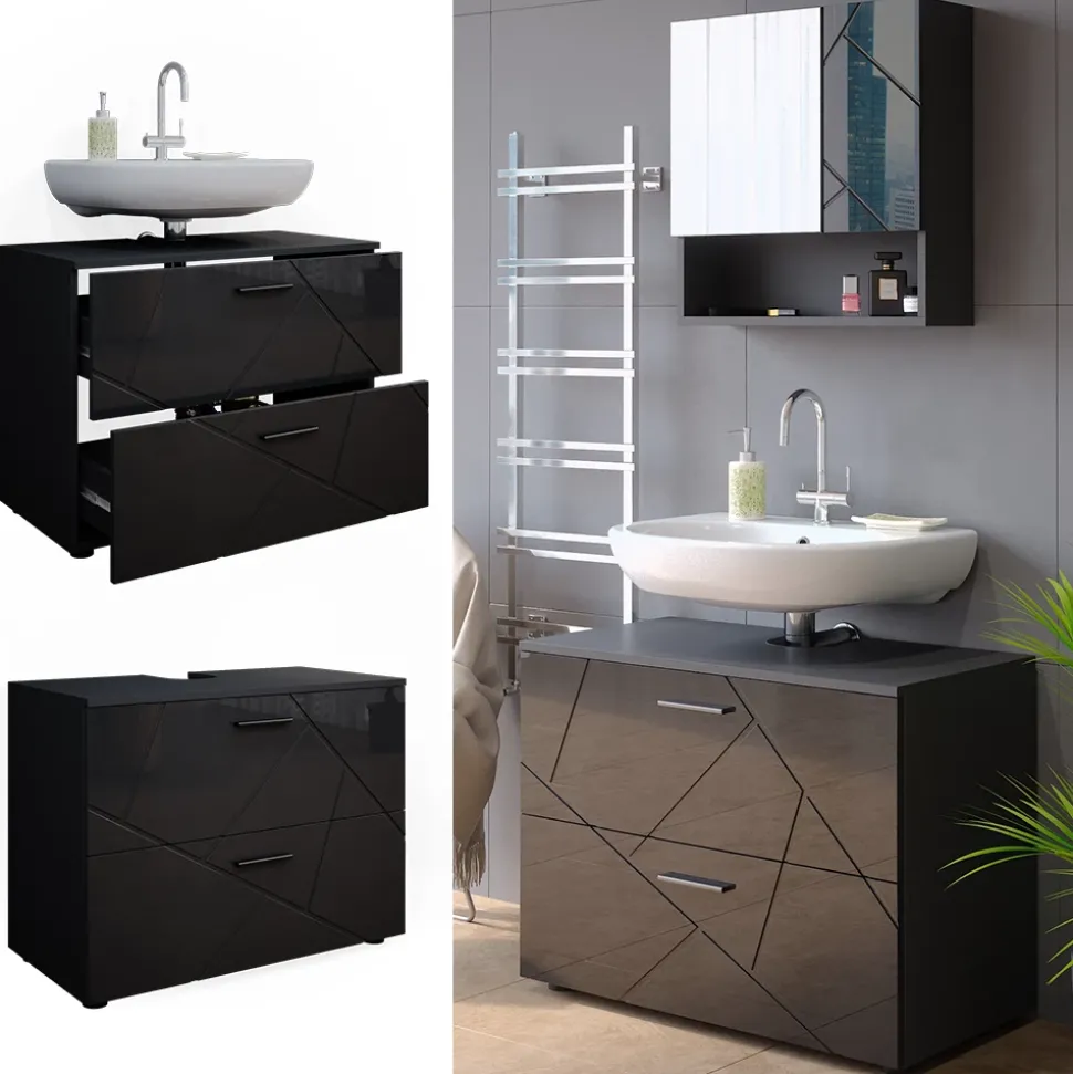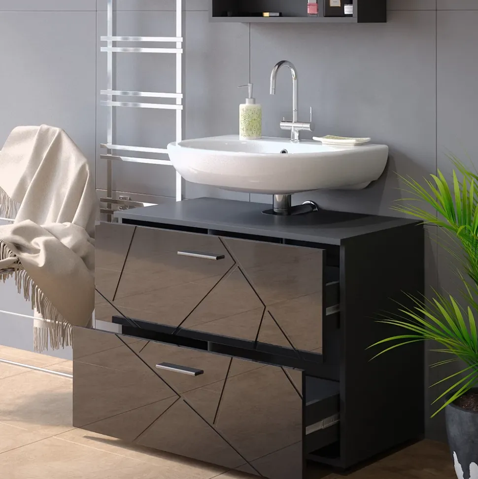 - Der Waschtischunterschrank verfügt über zwei Schubladen und bietet viel Stauraum. Eine Aussparung für den Siphon ist vorhanden.