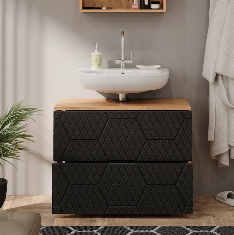 - MATERIAL: Der Waschtischunterschrank besteht aus pflegeleichter, melaminharzbeschichteter 16 mm Spanplatte