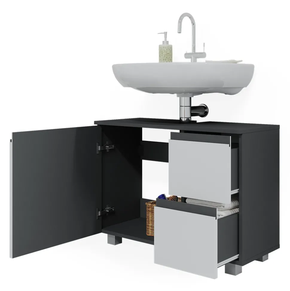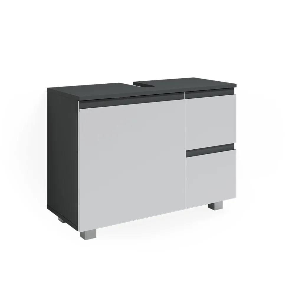- Der Waschtischunterschrank bietet mit Flügeltür und 2 Schubladen viel Stauraum, inklusive Aussparung für den Siphon.