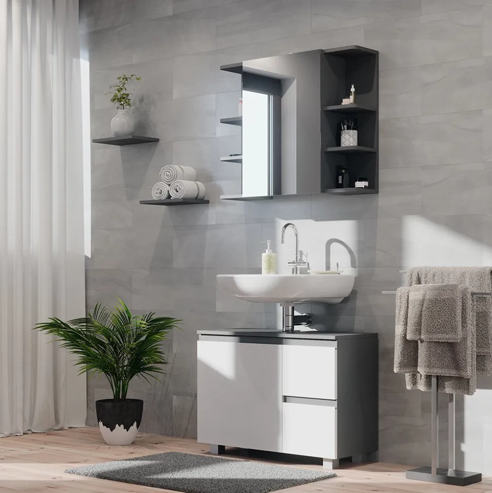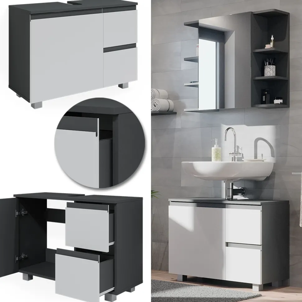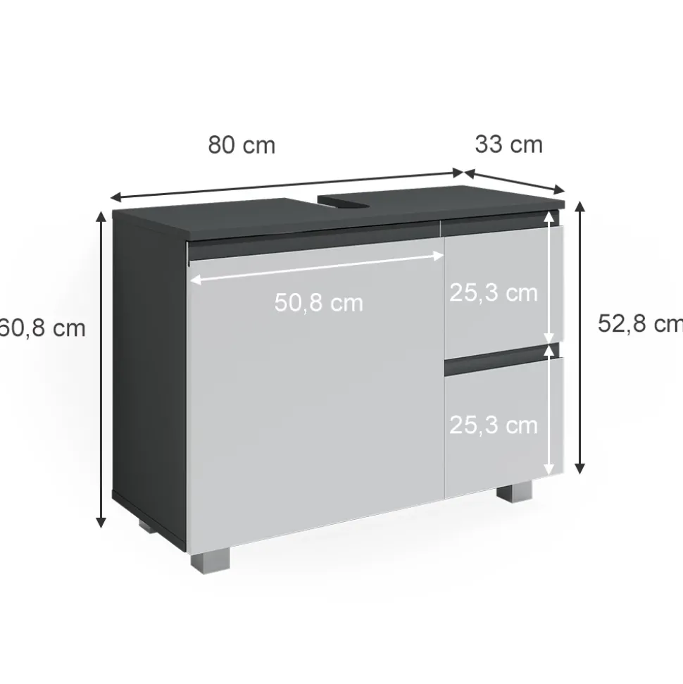 - MAßE: Der Unterschrank für das Badezimmer hat eine Breite von 80 cm, eine Höhe von 61 cm und eine Tiefe von 33 cm. Alle detaillierten Größen sind auf den Fotos angegeben.