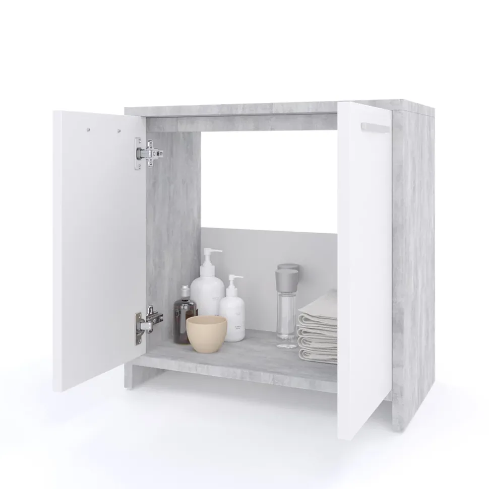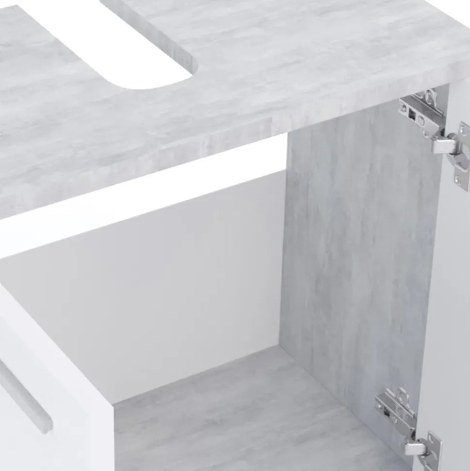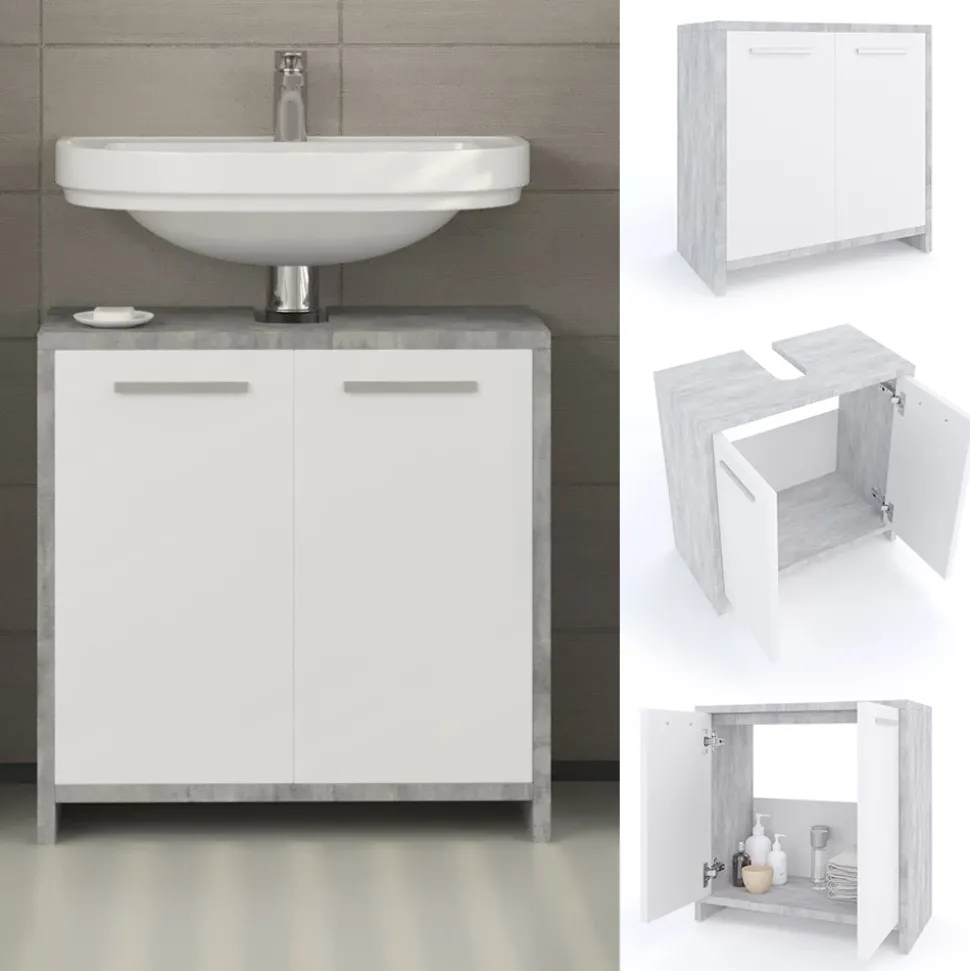 - Waschtischunterschrank mit zwei Flügeltüren, es gibt eine Aussparung für einen Siphon