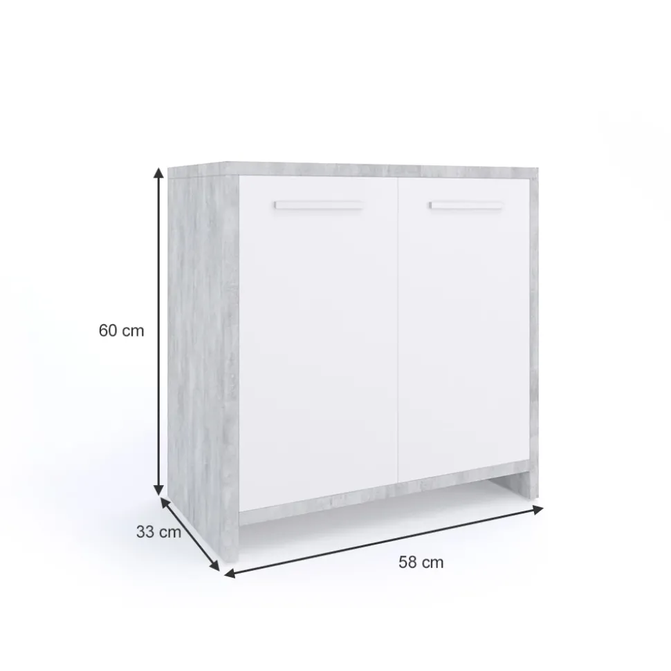 - MAßE: Der Unterschrank für das Badezimmer hat eine Breite von 58 cm, eine Höhe von 60 cm und eine Tiefe von 33 cm. Alle detaillierten Größen sind auf den Fotos angegeben.