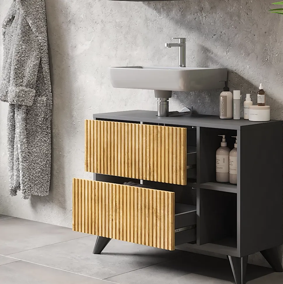 Der Waschbeckenunterschrank Leano ist die Lösung für alle, die ihr Badezimmer stilvoll und funktional gestalten möchten. Mit seinem geräumigen Stauraum bietet er Platz für all Ihre Badezimmerutensilien und hilft Ihnen dabei, Ihr Bad ordentlich zu halten. Der Waschtischunterschrank ist nicht nur praktisch, sondern auch optisch ansprechend und verleiht Ihrem Badezimmer einen modernen Look. Investieren Sie in den Badunterschrank Leano und erleben Sie, wie Ihr Badezimmer zu einem Ort der Entspannung und des Wohlbefindens wird. Gönnen Sie sich dieses hochwertige Badmöbel für Ihr Waschbecken und genießen Sie jeden Tag Ihr persönliches Spa-Erlebnis.